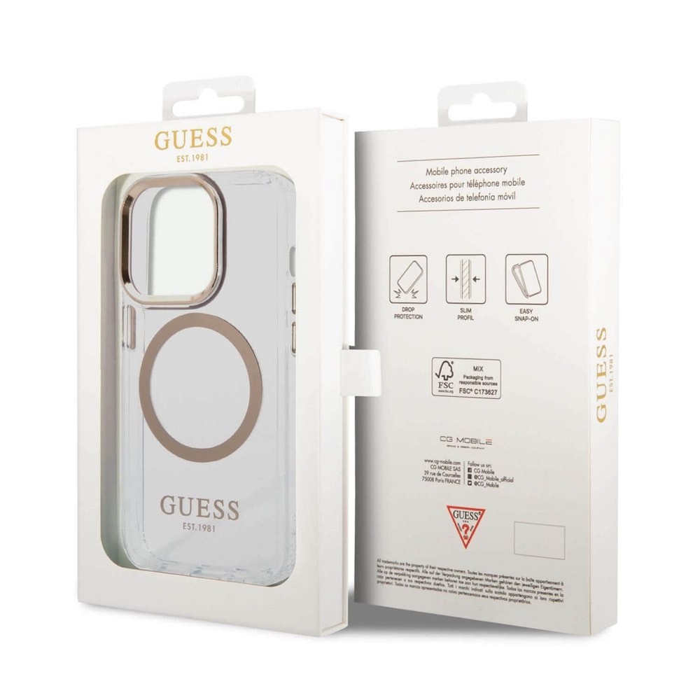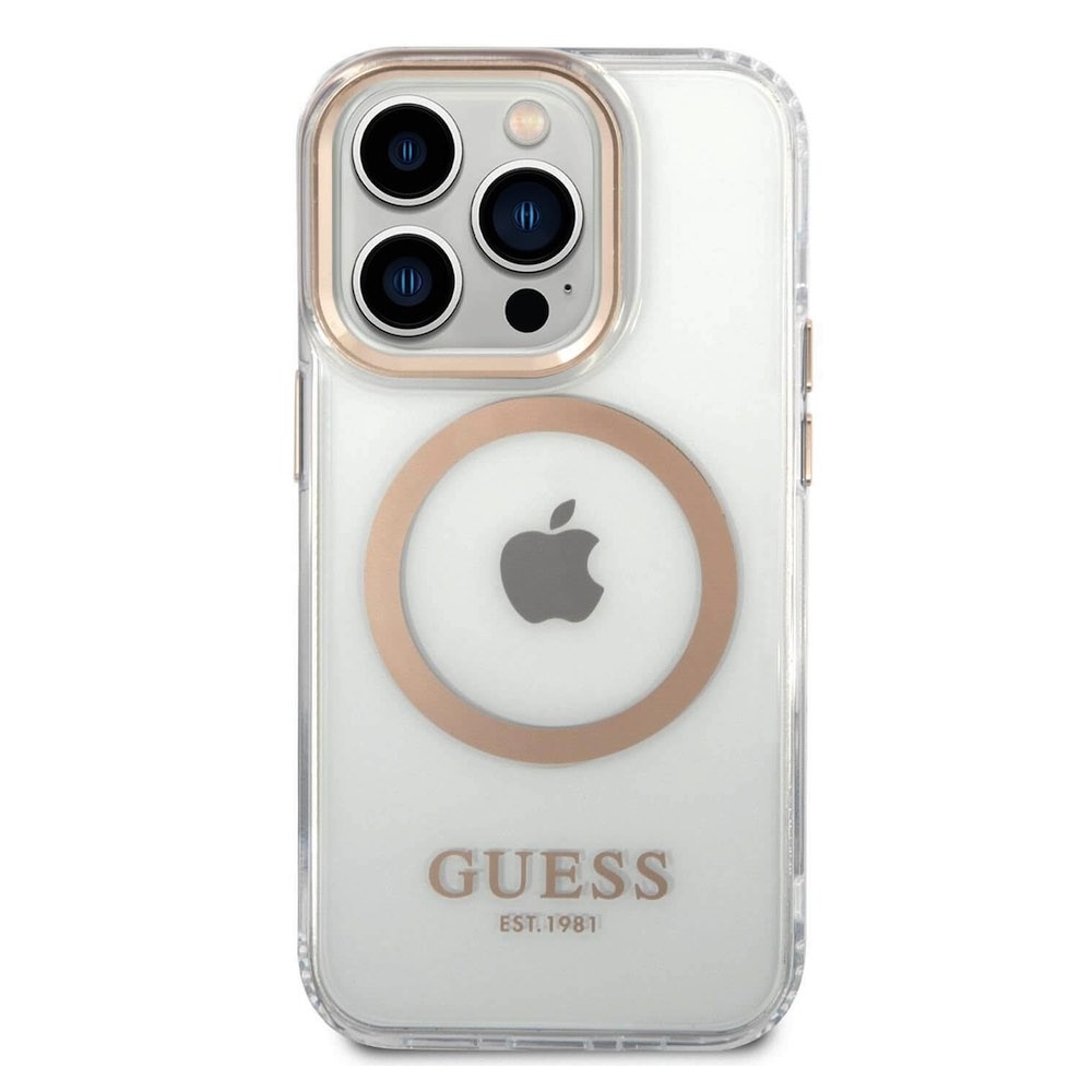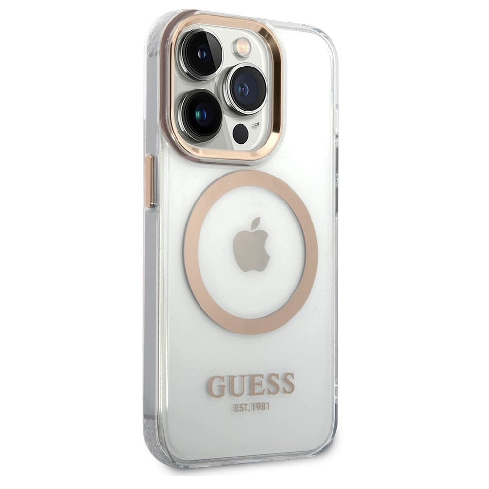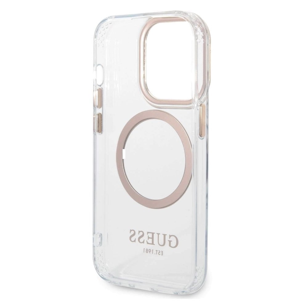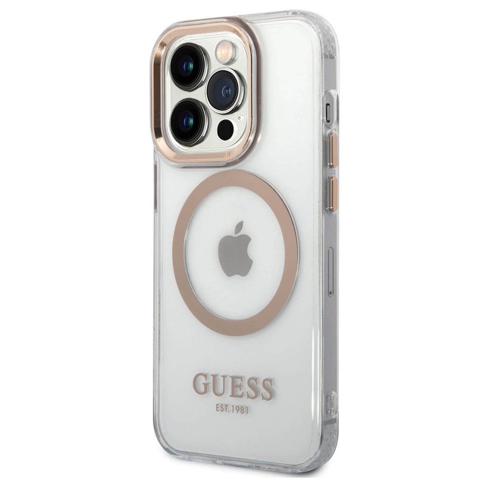 Guess Translucent MagSafe Case - хибриден удароустойчив кейс с MagSafe за iPhone 14 Pro Max (златист-прозрачен)