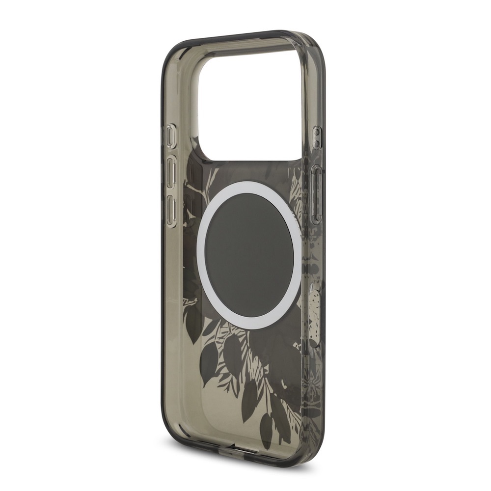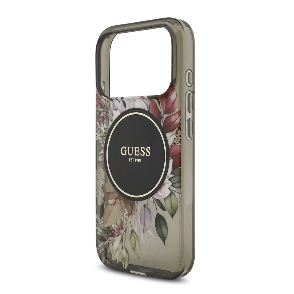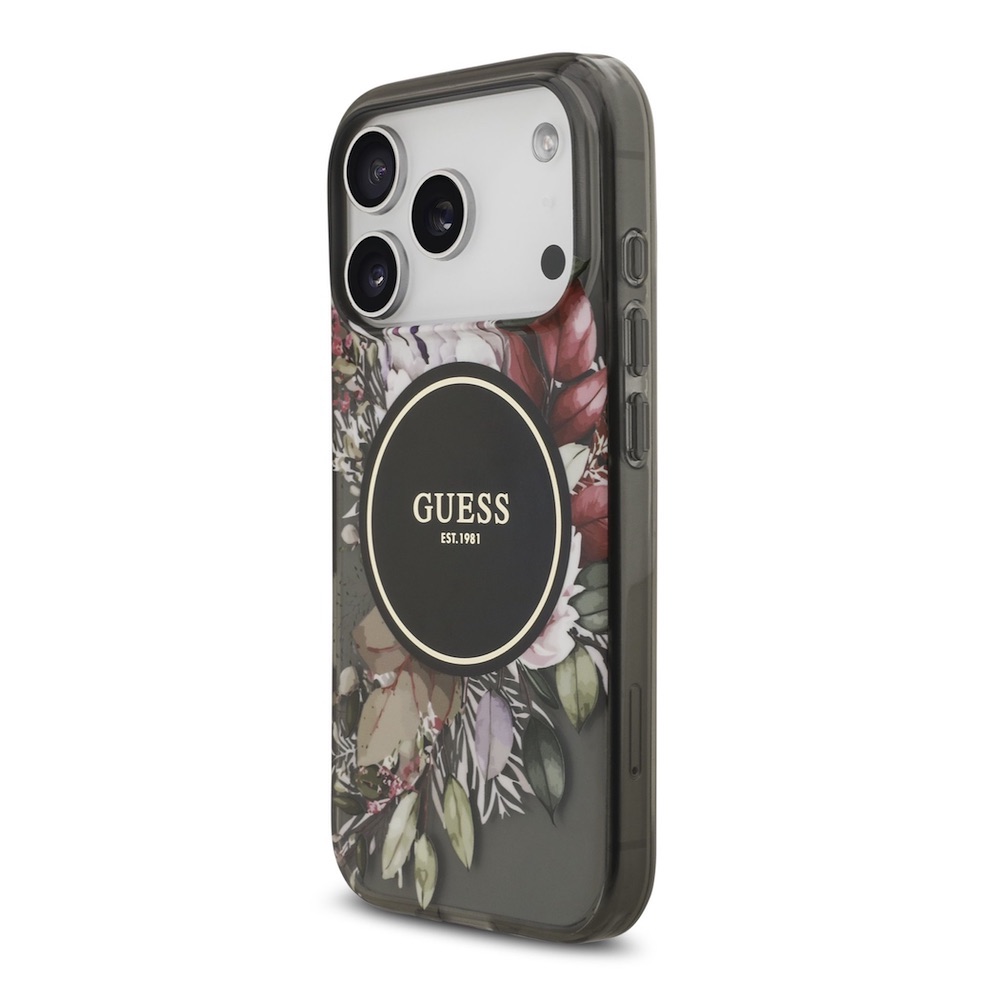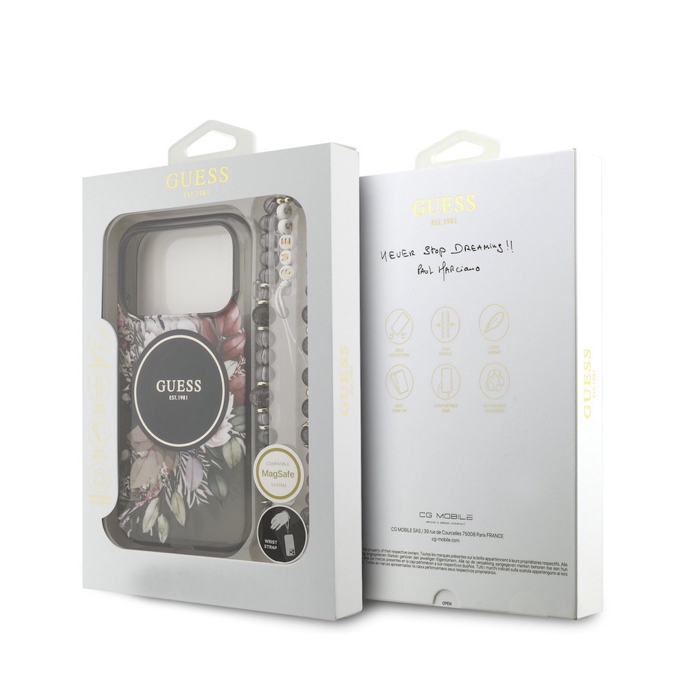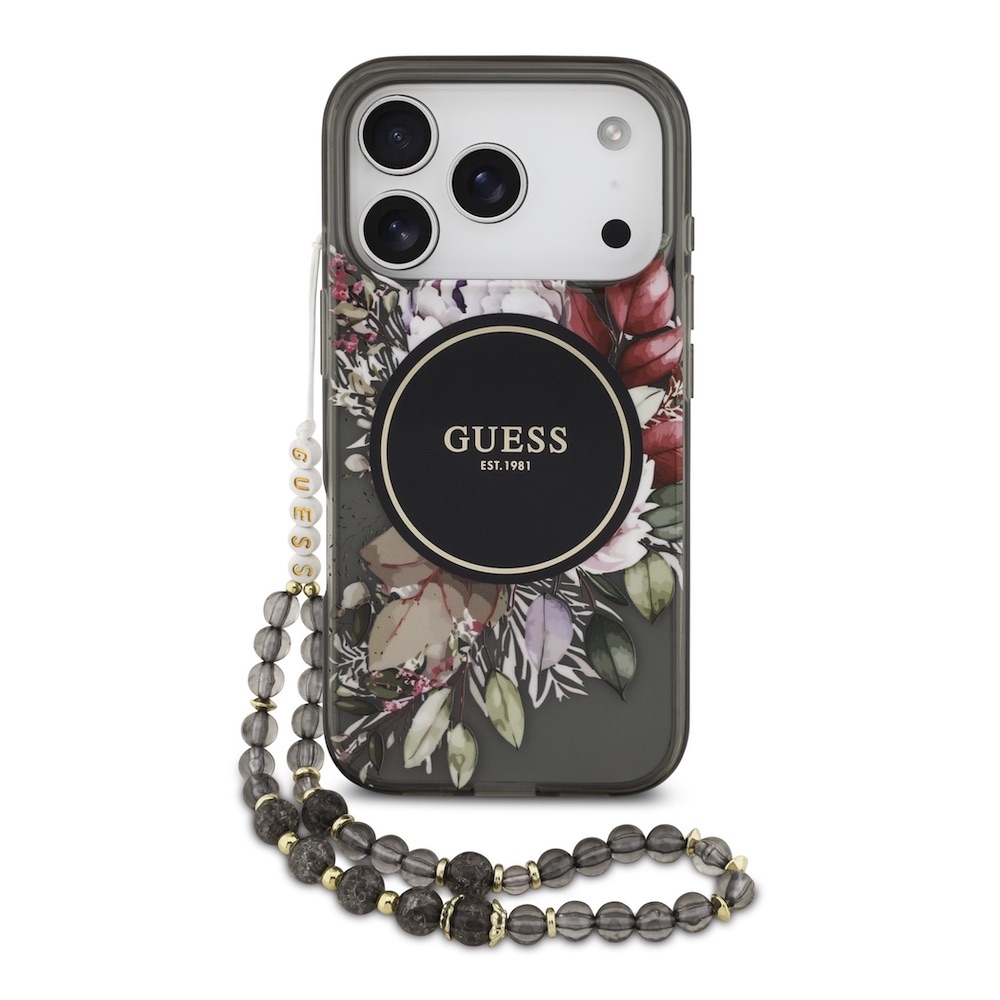 Хибриден удароустойчив кейс с MagSafe и връзка за ръка за iPhone 17 Pro - Guess IML Flowers Pearl MagSafe Case (черен)