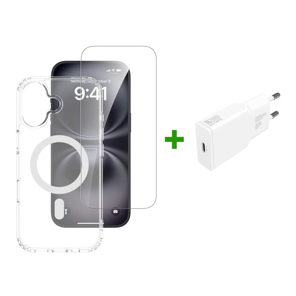 Хибриден удароустойчив кейс с MagSafe, стъклено покритие за дисплея и 20W захранване за iPhone 17 - 4smarts 3-in-1 Premium MagSafe Starter Set (прозрачен)