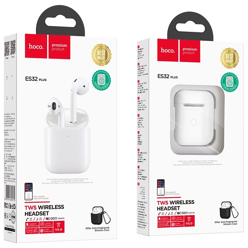 - Hoco ES32 Plus е подобрена версия на ES32. Новият модел запазва същите размери, запазвайки ергономичната форма на слушалките и възможността за безжично зареждане на кутията. Добавен е сензор, който проследява къде се намира слушалката: в ухото или не и е подобрен капацитета на батерията на кейса. Благодарение на TWS технологията, слушалките могат да се използват както заедно, така и отделно. За да контролирате възпроизвеждането на музика, да отговаряте на входящи повиквания и да повикате гласовия асистент, на корпуса на двете слушалки се намира тъч бутон. С едно зареждане слушалките възпроизвеждат музика в продължение на 3.5 часа. В комплекта са включени и силиконов калъф с карабинер