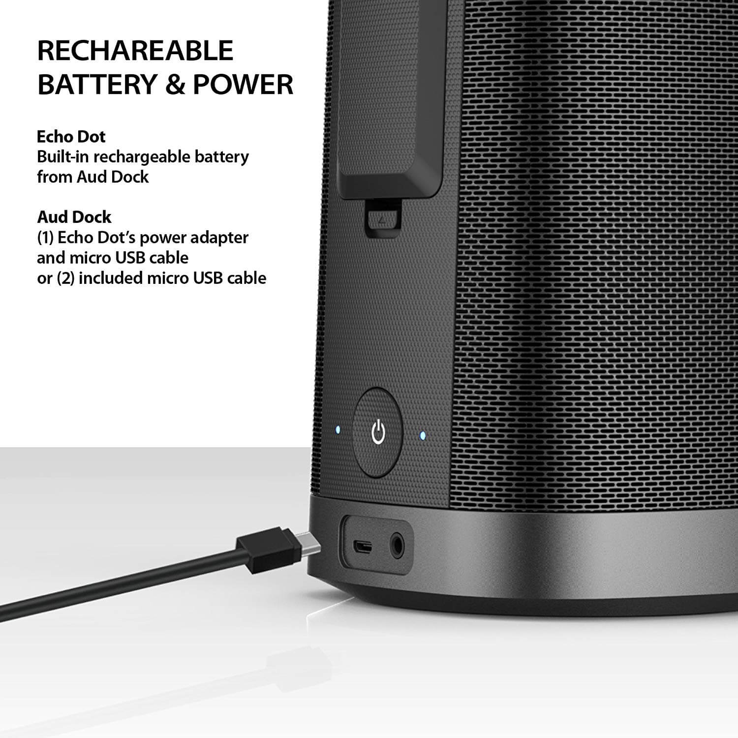 - Презареждаща се батерия и мощност - Echo Dot получава захранване от Aud Dock. Можете да зареждате Aud Dock със адаптера за захранване на Amazon Echo Dot и Micro USB кабел или чрез включения микро USB кабел за зареждане