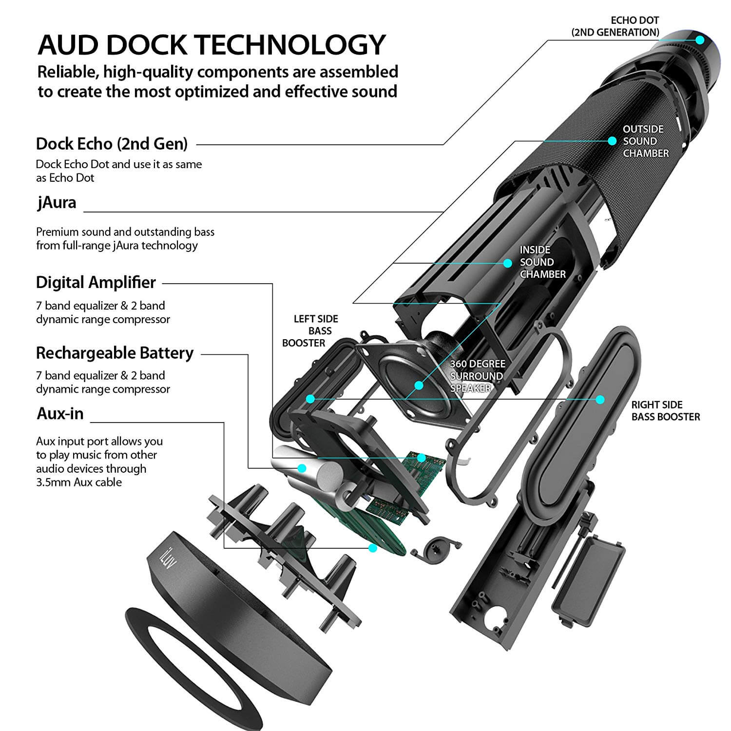 - Aud Dock е докинг система, която обхваща вашата Echo Dot на върха на устройството. Оборудвана с един динамичен високоговорител и два бас усилвателя, Aud Dock ще предава пълен набор от звуци с обогатен бас за вашата музика. Работи с вградена презареждаема батерия, което прави Echo Dot напълно преносима. Вградена презареждаема батерия на Aud Dock Power Echo Dot, позволяваща на Echo Dot да се освободи от зарядно устройство за стена.