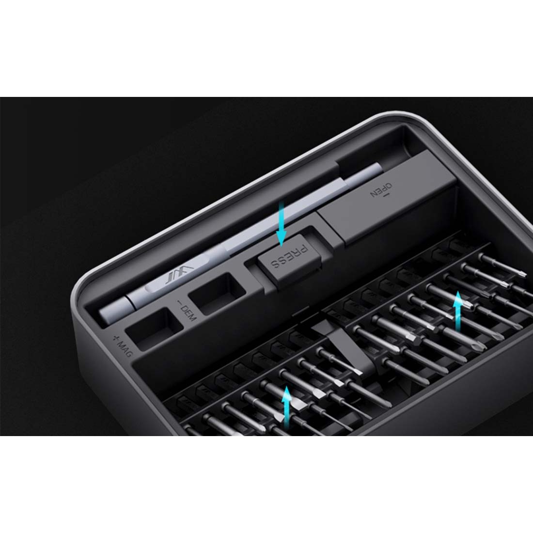 - Когато натиснете бутона в средата, битовете ще променят позицията си на вертикална, което улеснява изваждането им. Под тях се намира допълнително отделение за по-големи винтове или резервни части