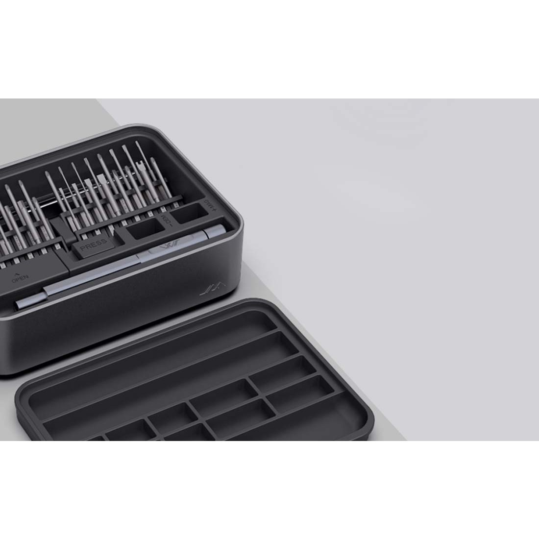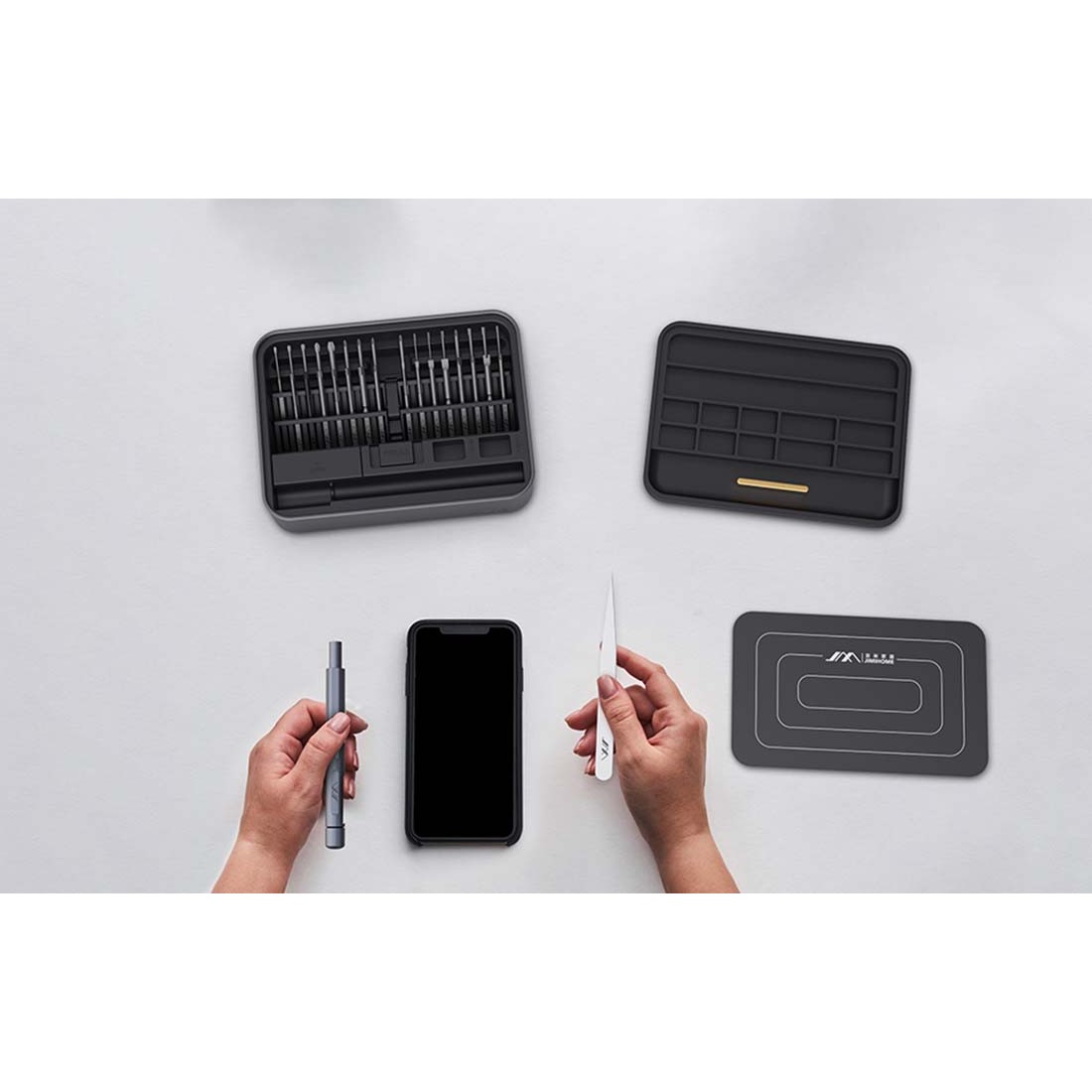 - В комплекта ще откриете пинсета, магнитна подложка, контейнер за части и битове за различни видове винтове