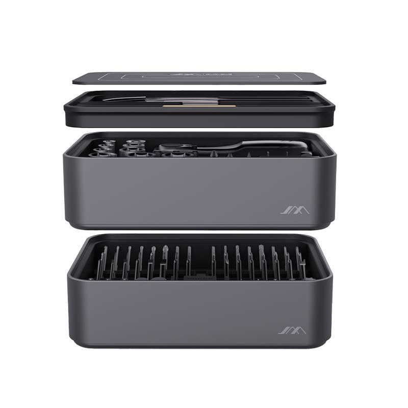 - Инструментите включват тресчотка и дръжка за отвертка с удобни удължители и адаптери и съответните битове. Диапазонът на битовете за тресчотковия ключ е от размер 5 до 13, а за отвертката H5, H4, H3, 5PH2, 5PH1, 3PH1, SL5, SL3 има 8 основни бита с размер 6,35 мм.