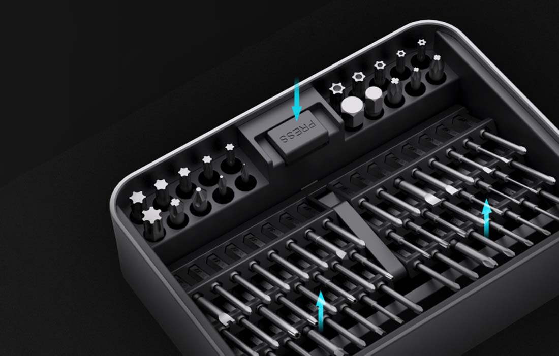 - В долната част на комплекта има място за общо 48 бита с размер 4 мм и 20 бита с размер 6,35 мм. За да можете по-лесно да изваждате всеки бит, просто натиснете бутона, който ще накара битовете да се издигнат вертикално. Под тях се намира контейнер за винтове и болтове, както и магнетизатор и размагнитвател за всяка част