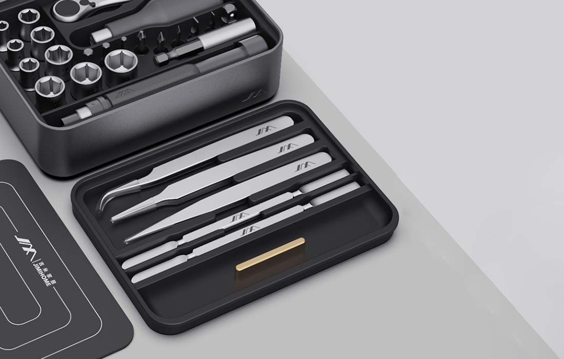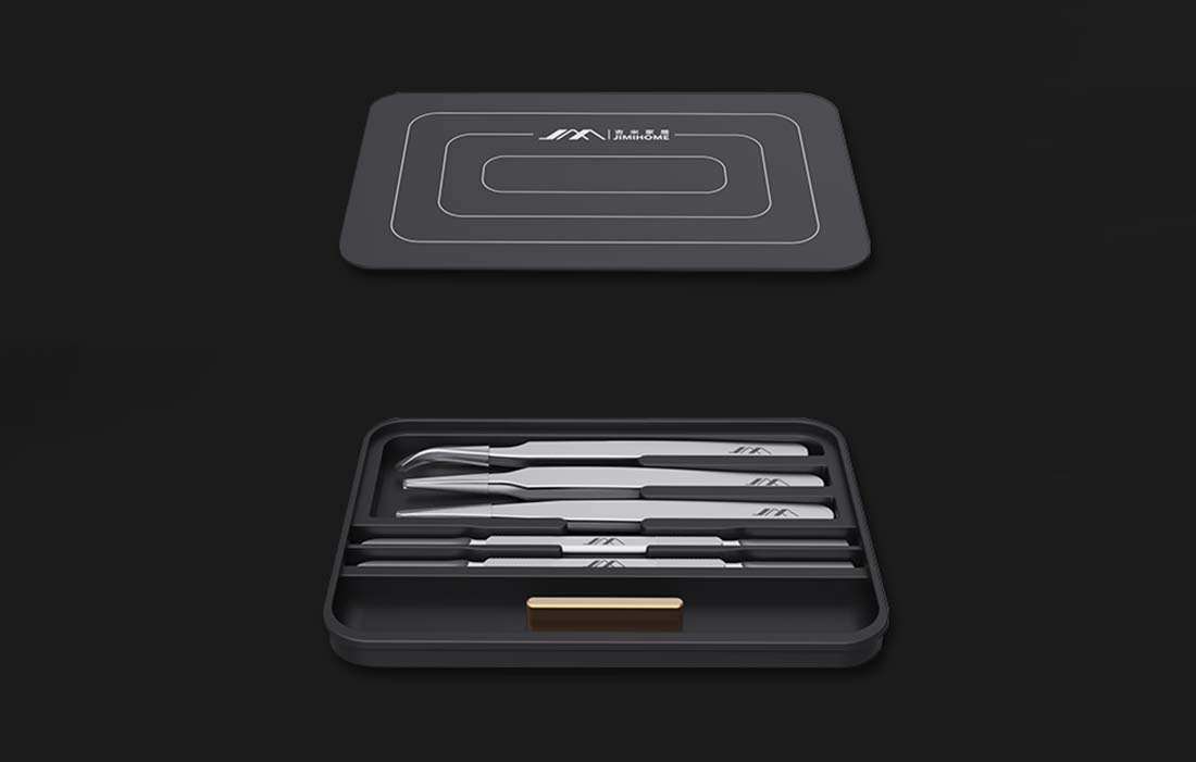 - Под магнитната подложка има място за 3 вида пинсети. Освен това комплектът е оборудван с две клиновидни остриета, които ще ви позволят внимателно да отваряте устройствата, които ремонтирате