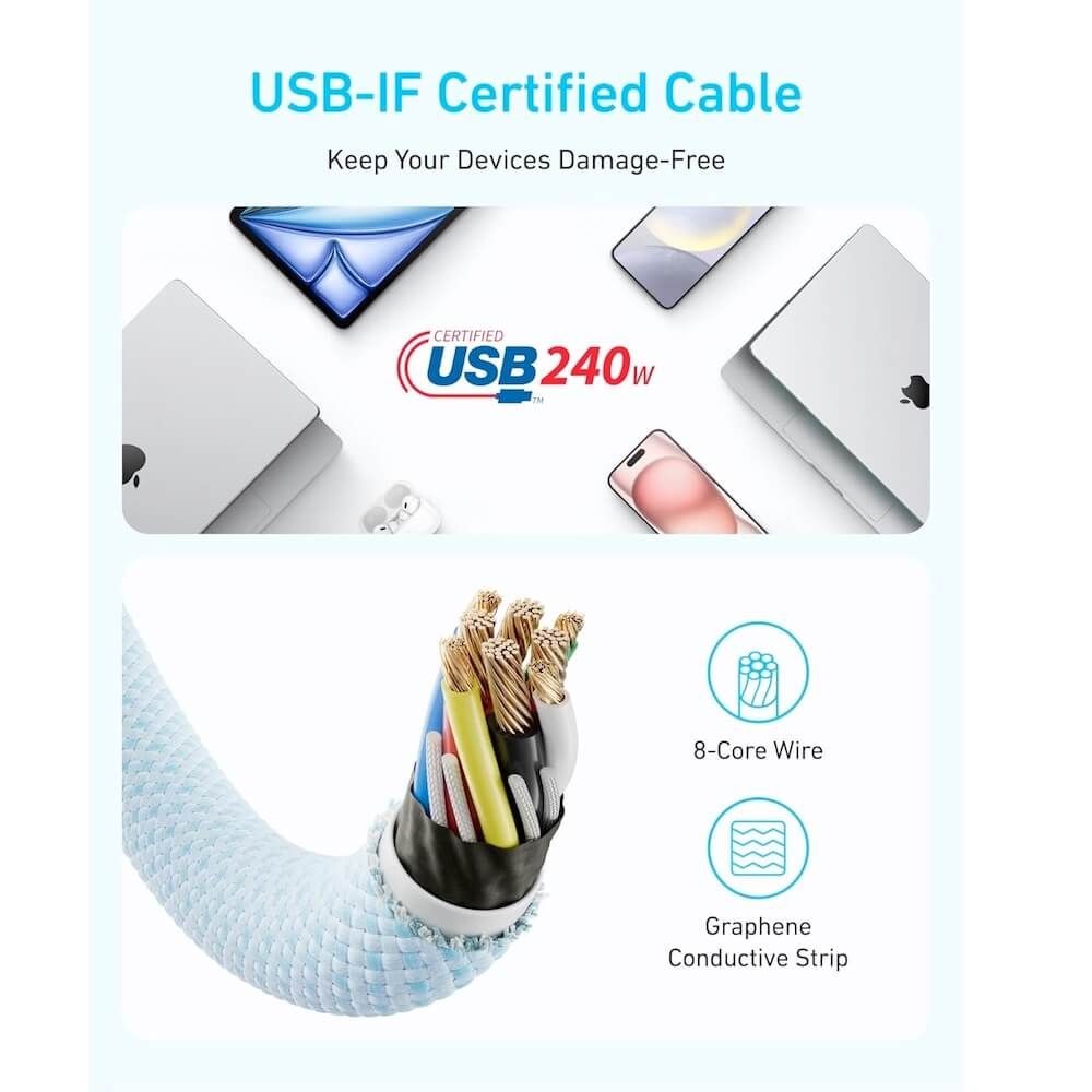 - В комплекта: 1 х Anker Zolo USB-C to USB-C Cable 240W. Всичко необходимо за вашето устройство.
