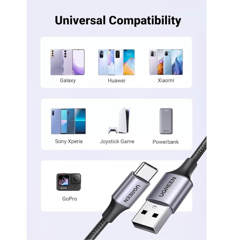 С USB-A към USB-C кабела на Ugreen, вие получавате не само качество, но и удобство. Той е съвместим с всички устройства с USB-C порт, което го прави изключително универсален. Идеален е за зареждане на смартфони, таблети и други устройства.