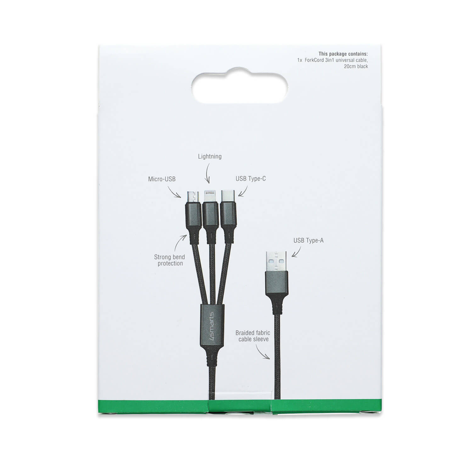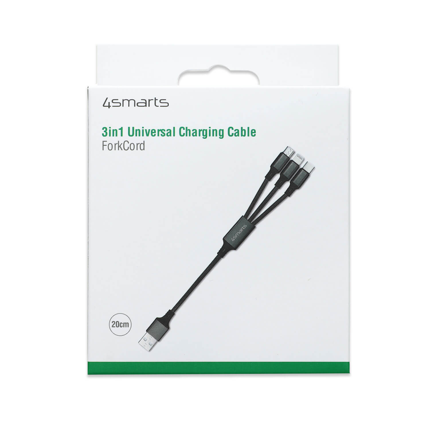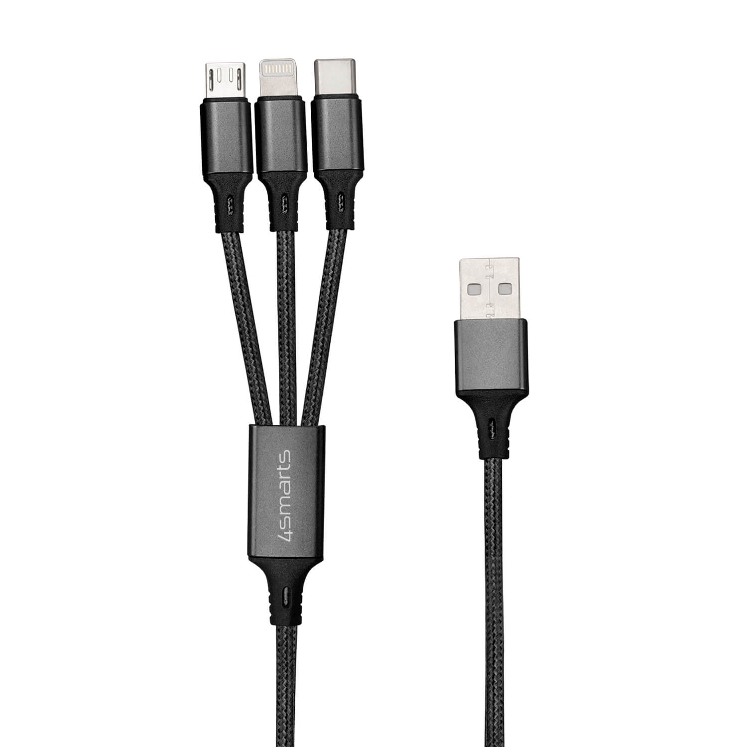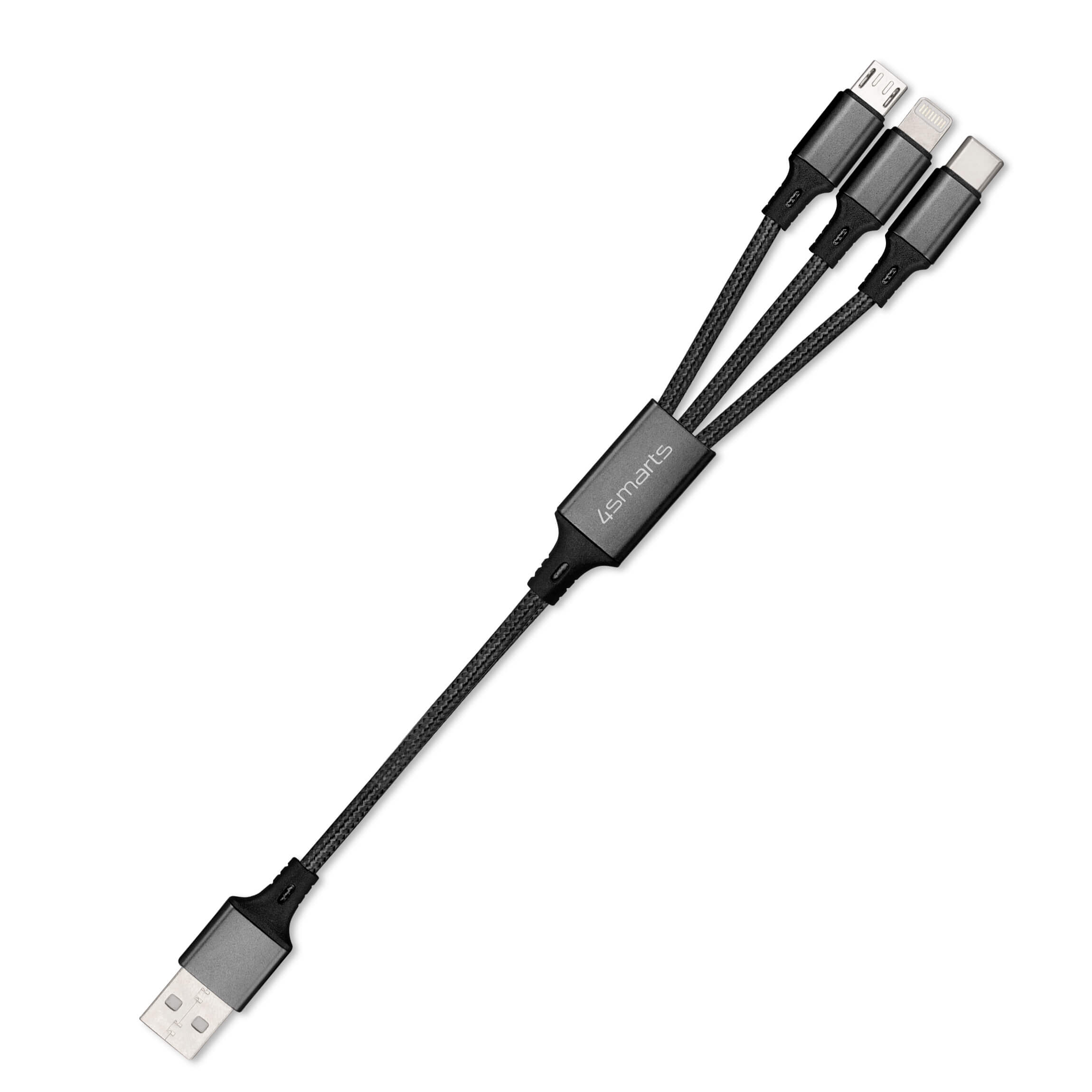 Качествен многофункционален кабел за microUSB, Lightning и USB-C стандарти (20см) - 4smarts 3in1 Cable ForkCord (черен)