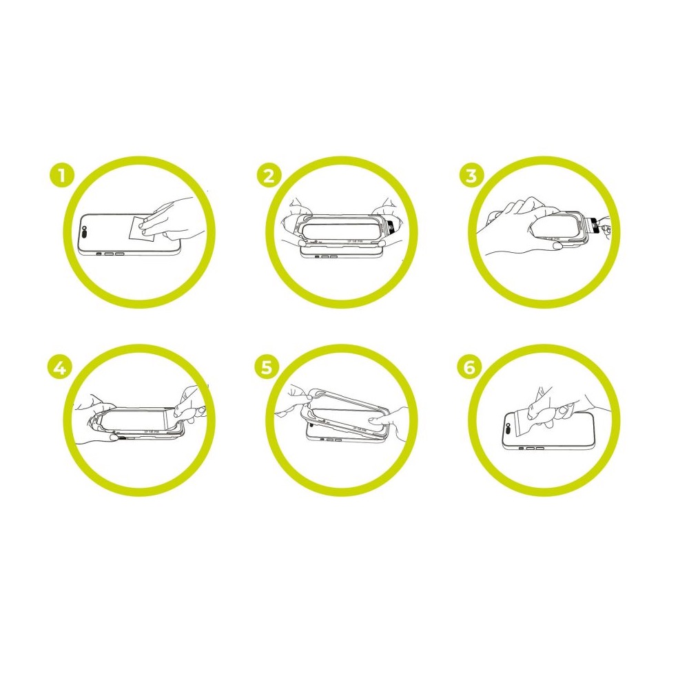Внимание: протекторът трябва да се поставя в безпрашна среда, за да се избегне попадането на прашинки между него и дисплея на вашето устройство! Внимание: поради това, че протекторът е изработен от стъкло, при поставянето му не трябва да прилагате сила или натиск върху него, за да не се повреди или счупи! Внимание: протекторът може да се премахне от дисплея и да се сложи наново, но това трябва да стане много внимателно. Ако е наложително, използвайте антистатичната лепенка в комплекта, за да премахнете прашинките от стъкления протектор при повторното поставяне. Инструкции: 1. Изчистете дисплея с кърпичката в комплекта или друга микрофибърна кърпичка, 2. Отлепете фолиото (залепено върху стъкления протектор), 3. Подравнете и приложете стъкления протектор върху телефона, 4. Ако има останали балончета с въздух, изб
