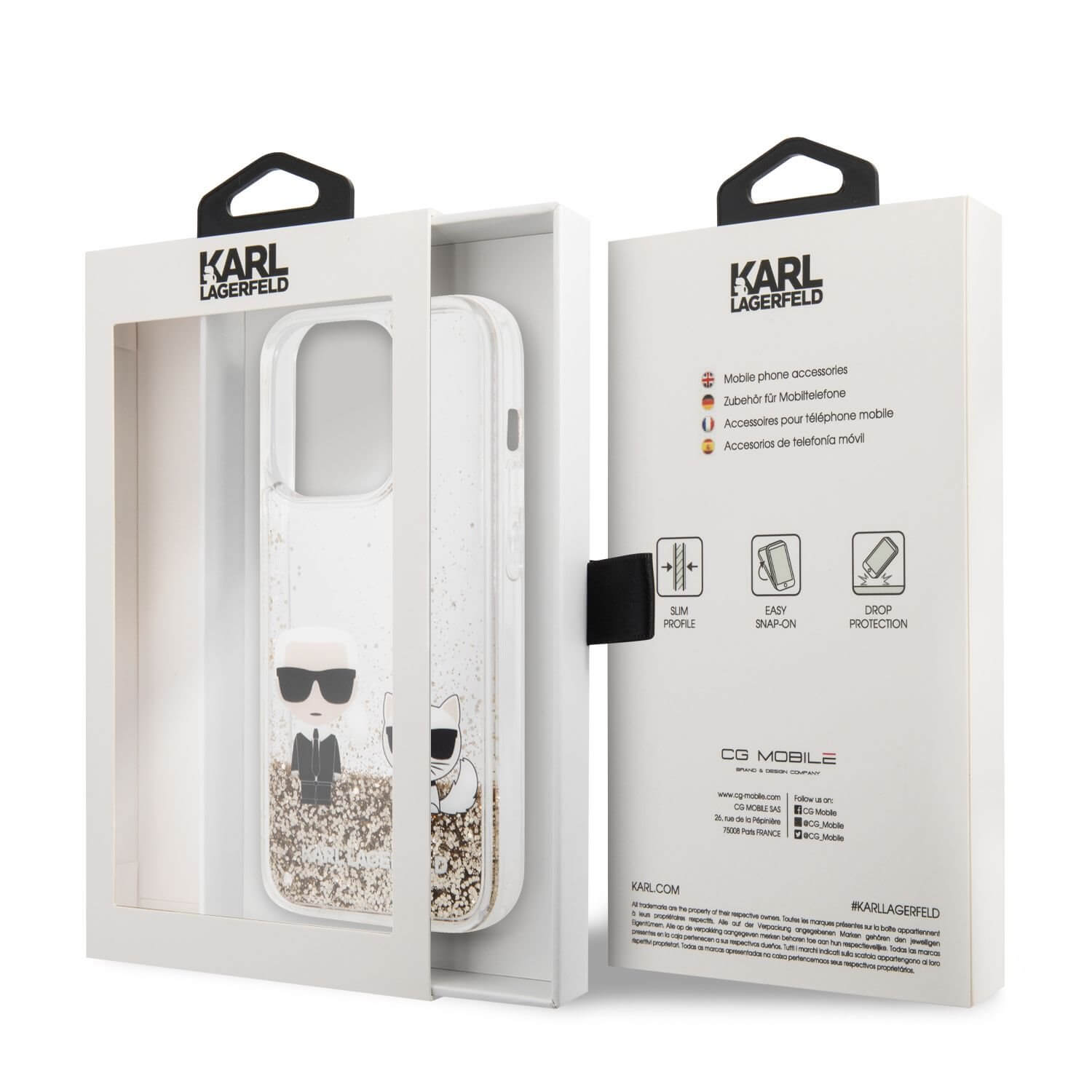 Karl Lagerfeld Liquid Glitter Karl and Choupette Case - дизайнерски кейс с висока защита за iPhone 14 Pro Max (прозрачен-златист)