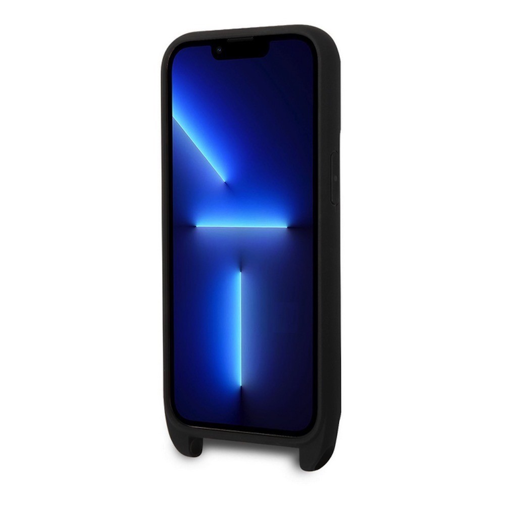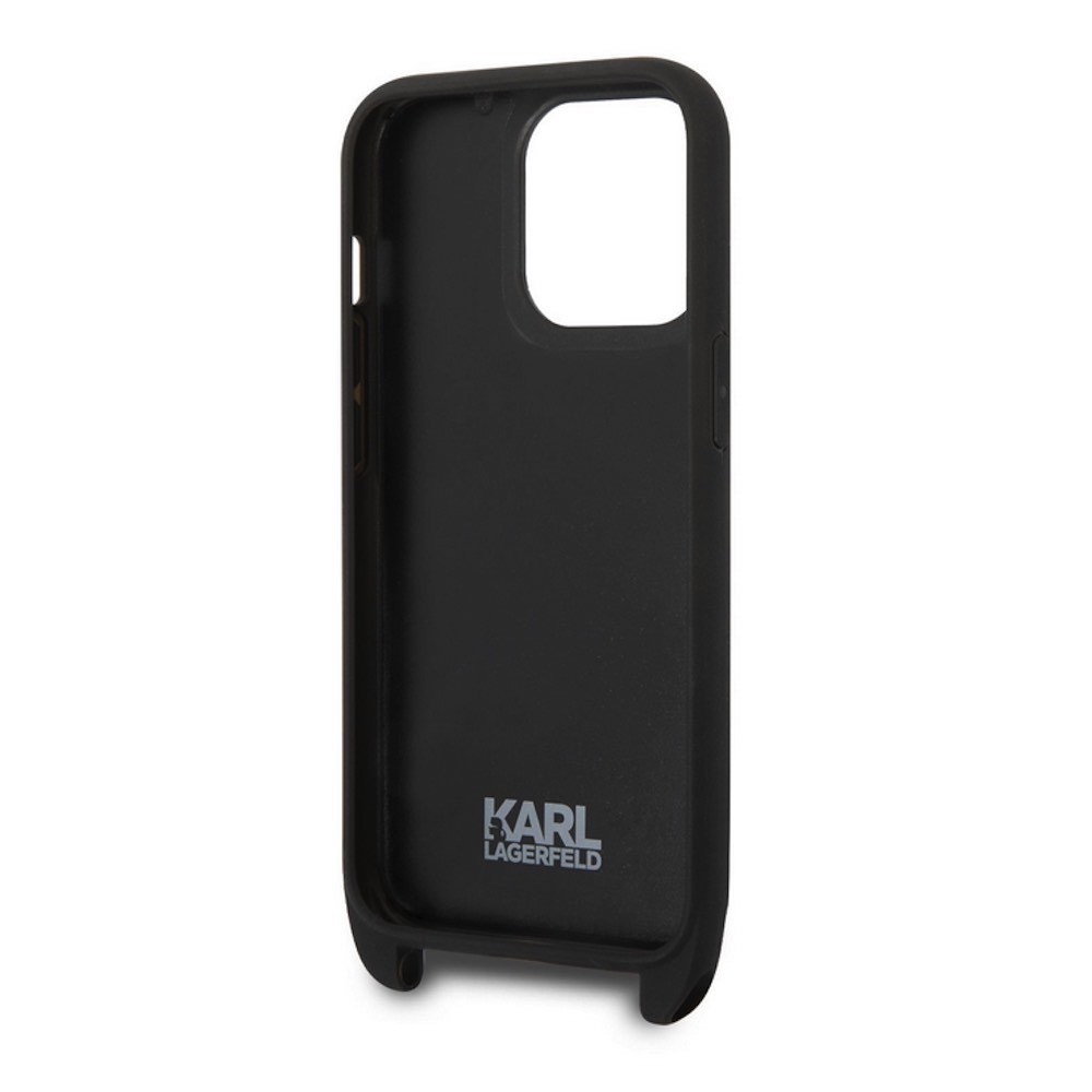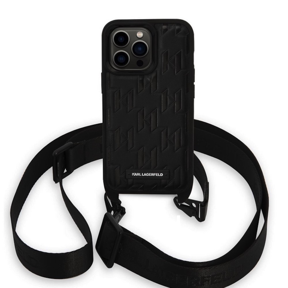 Karl Lagerfeld Monogram Crossbody Case - дизайнерски кожен кейс с връзка за носене за iPhone 14 Prо Max (черен)