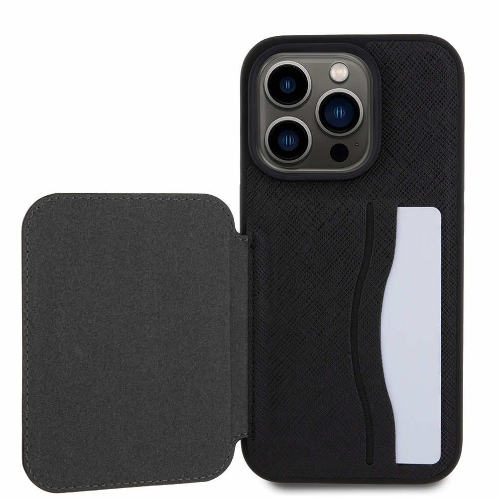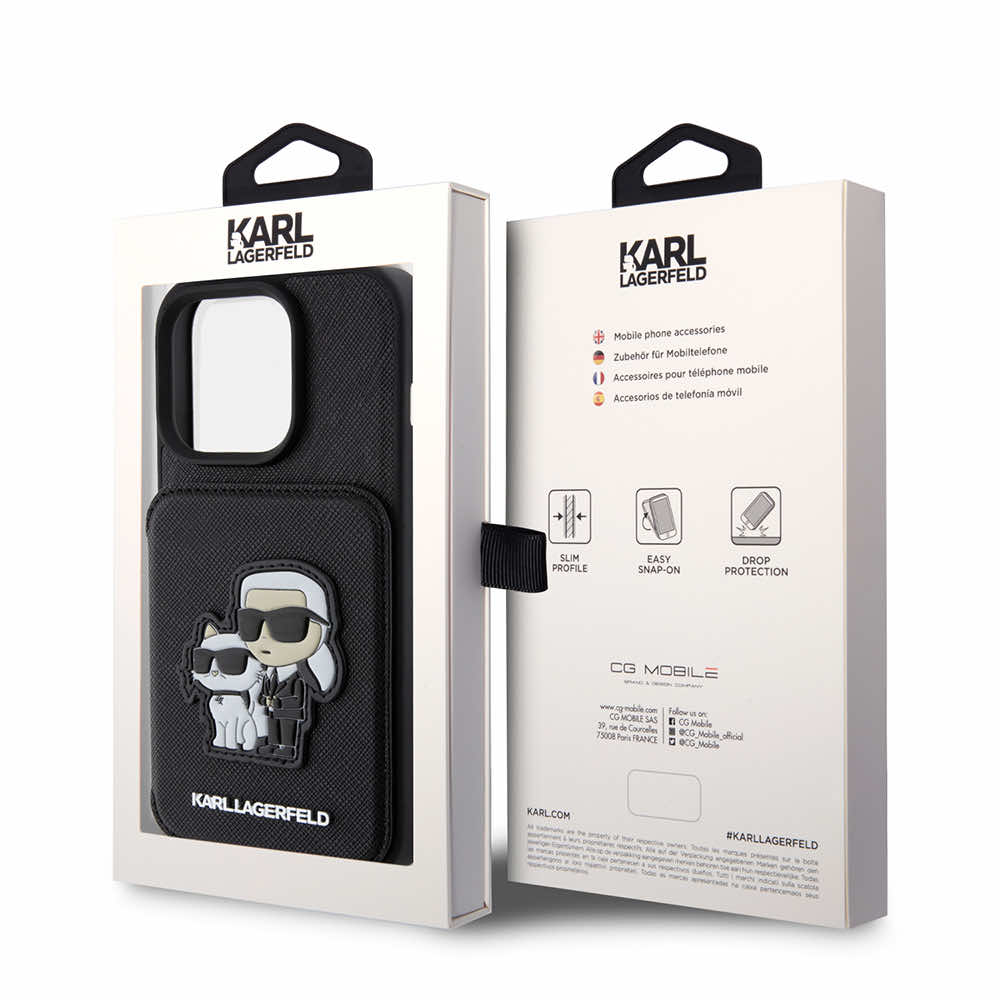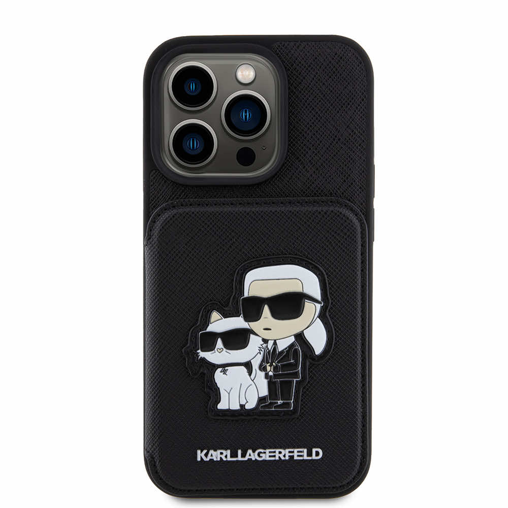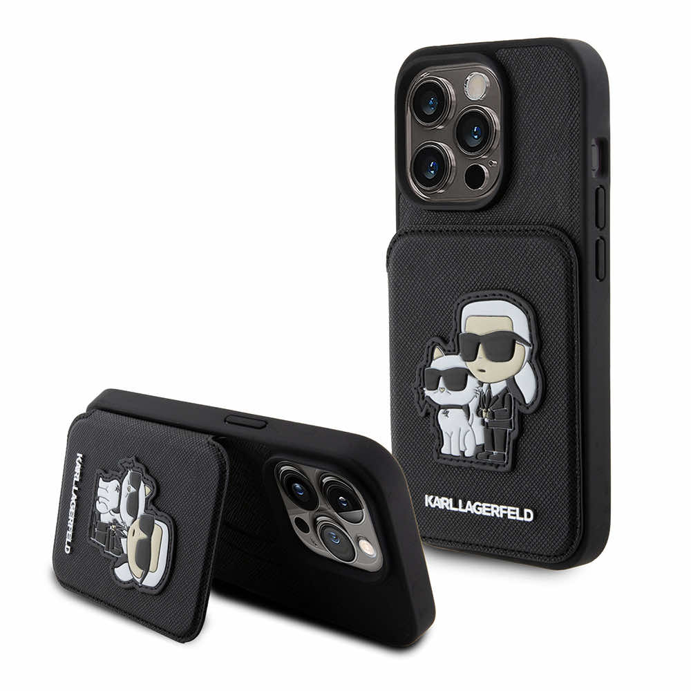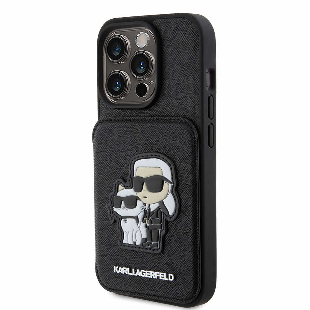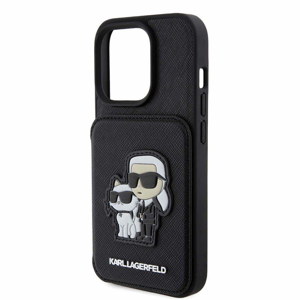 Karl Lagerfeld PU Saffiano Card Slot Stand Karl and Choupette Case - дизайнерски кожен кейс с отделение за карти за iPhone 15 Pro Max (черен)