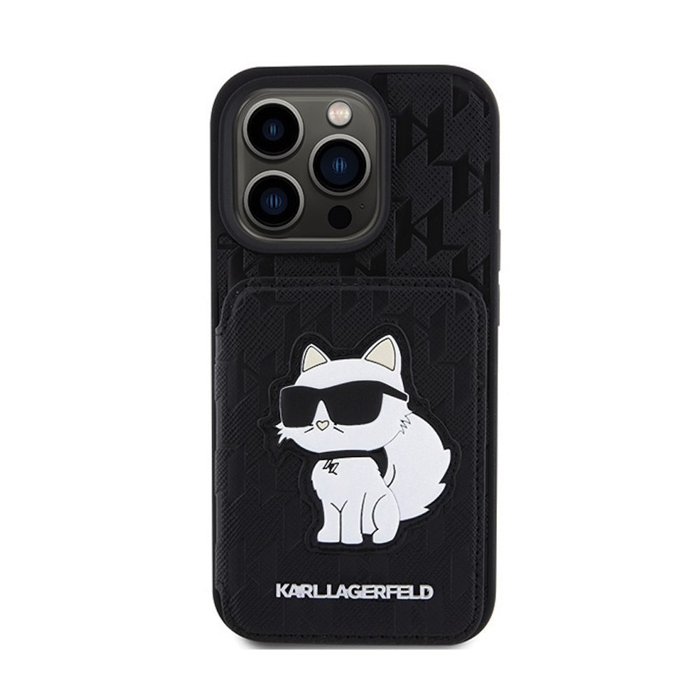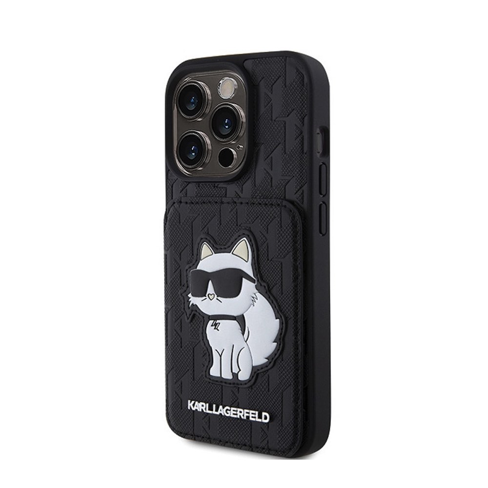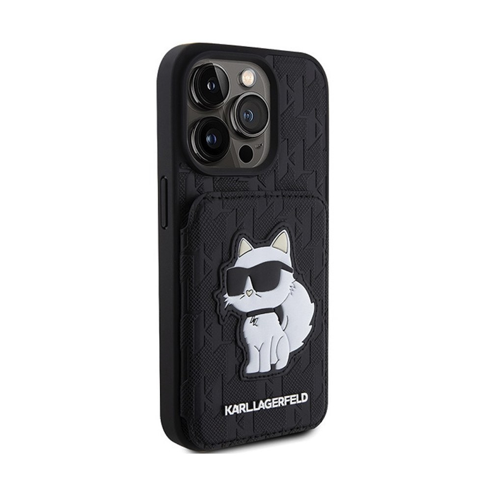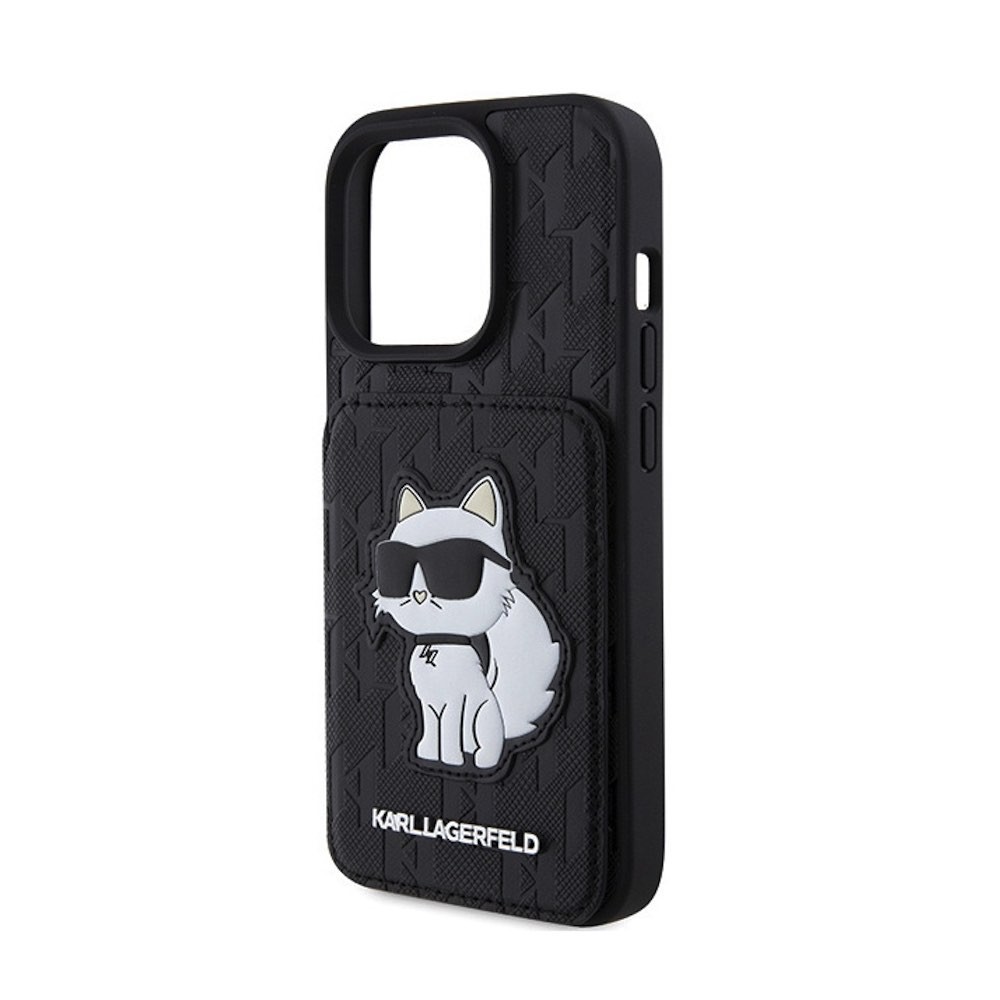 Karl Lagerfeld PU Saffiano Monogram Choupette Card Slot Stand Case - дизайнерски кожен кейс с отделение за карти за iPhone 15 Pro Max (черен)