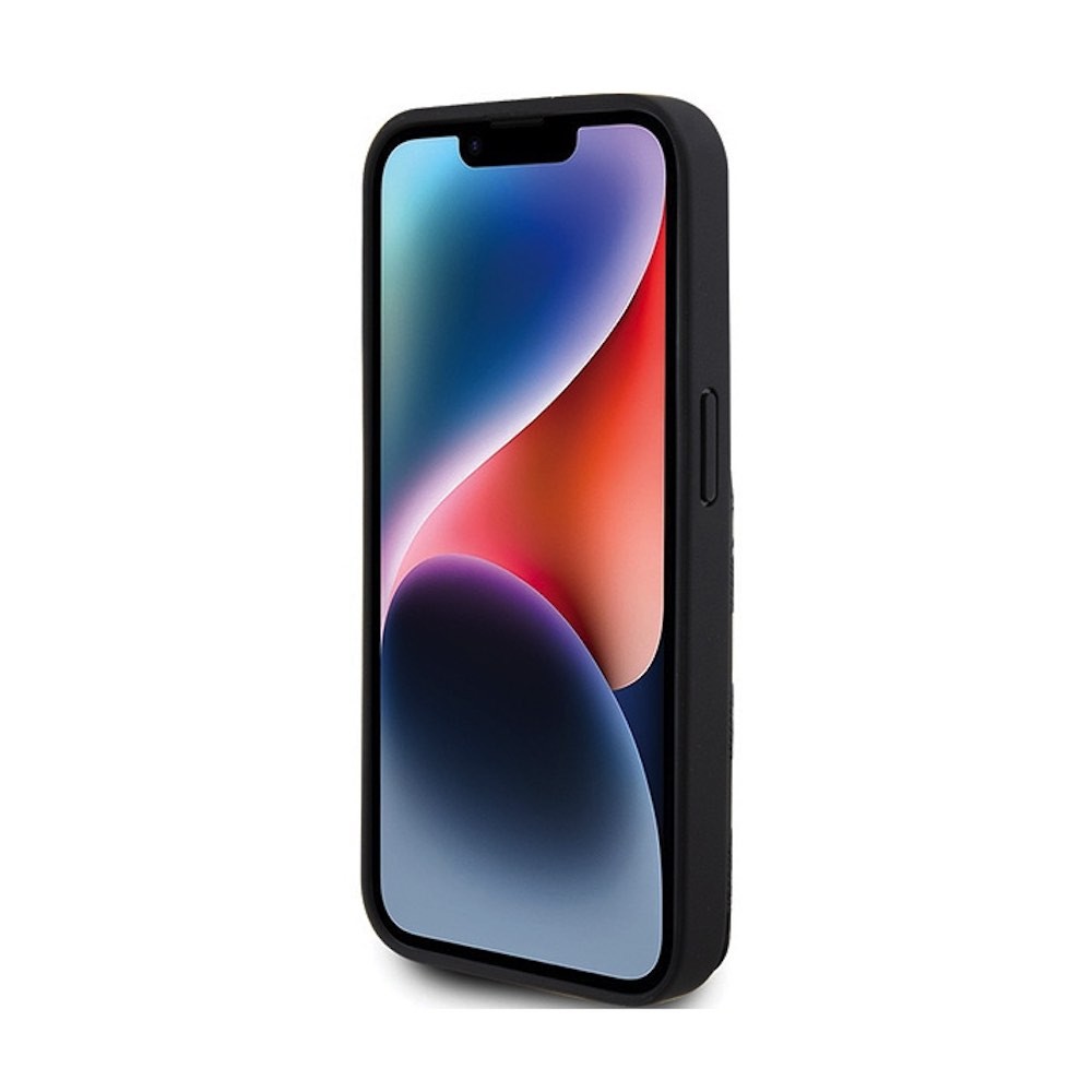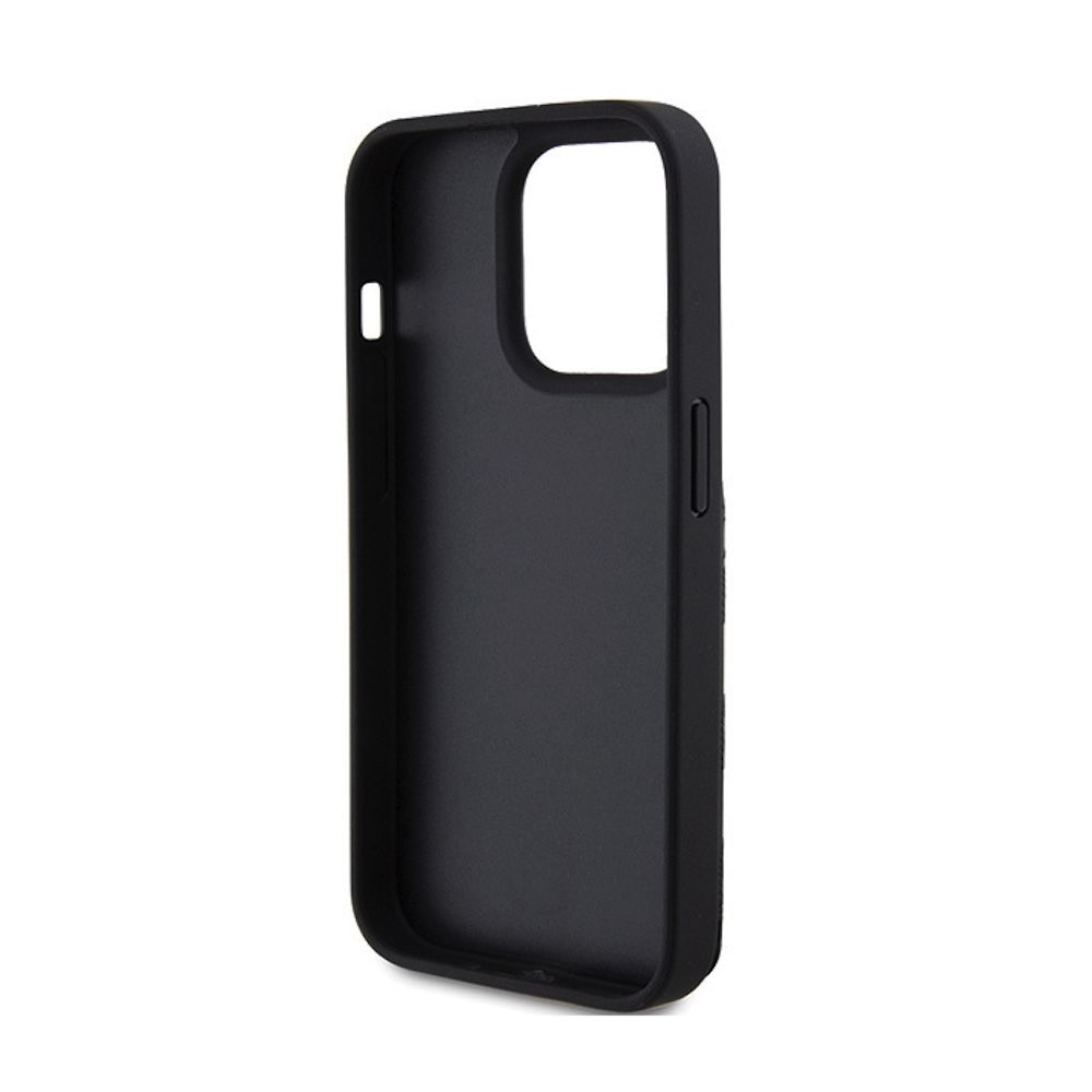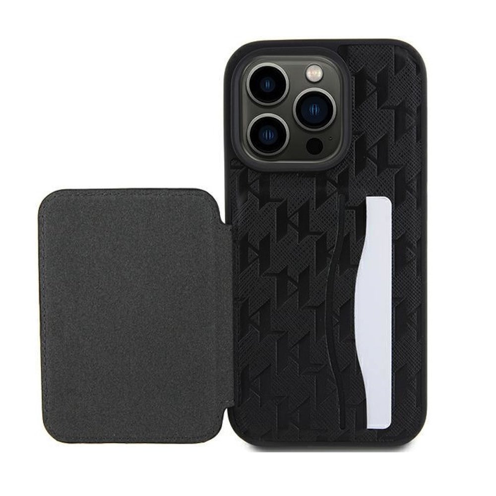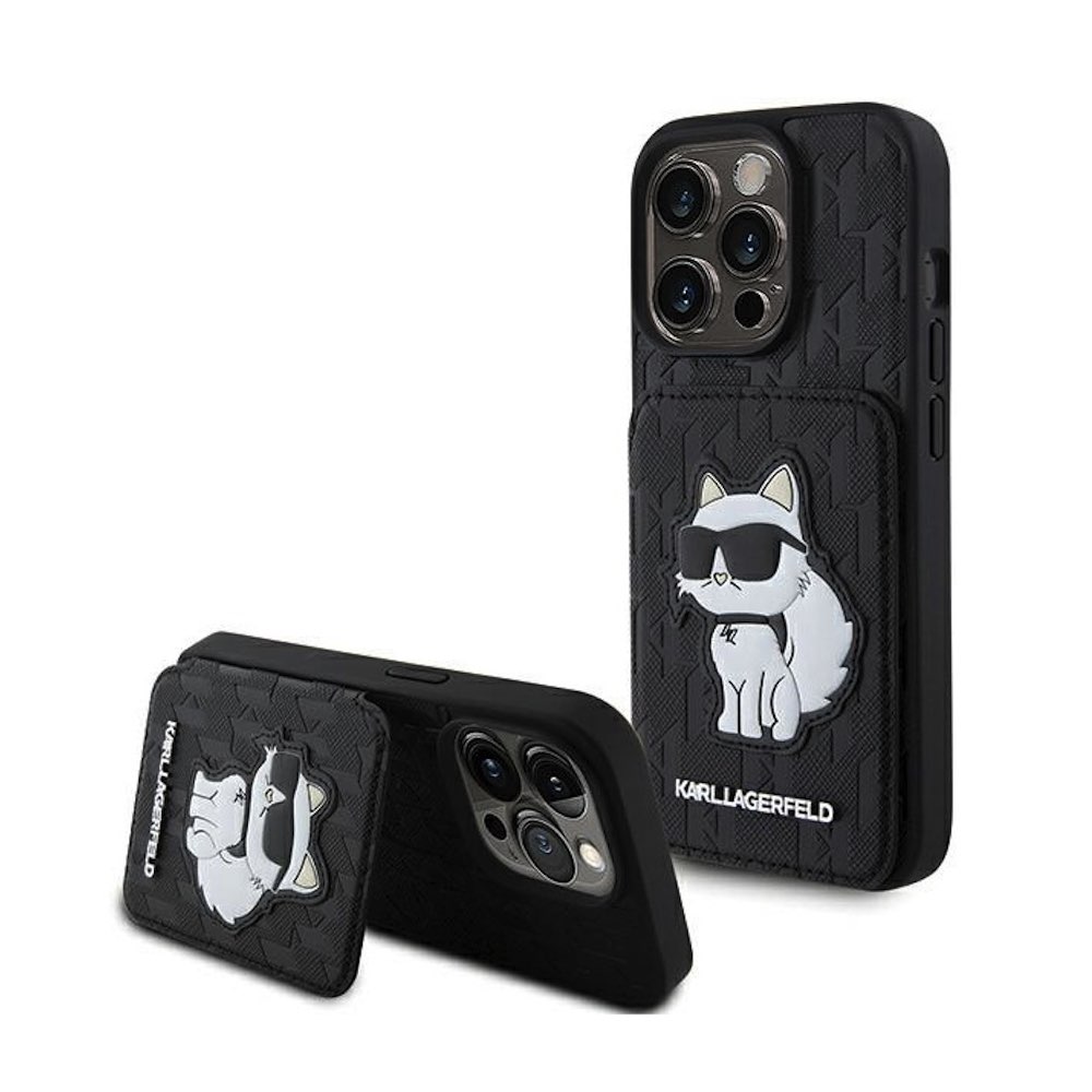 Karl Lagerfeld PU Saffiano Monogram Choupette Card Slot Stand Case - дизайнерски кожен кейс с отделение за карти за iPhone 15 Pro Max (черен)