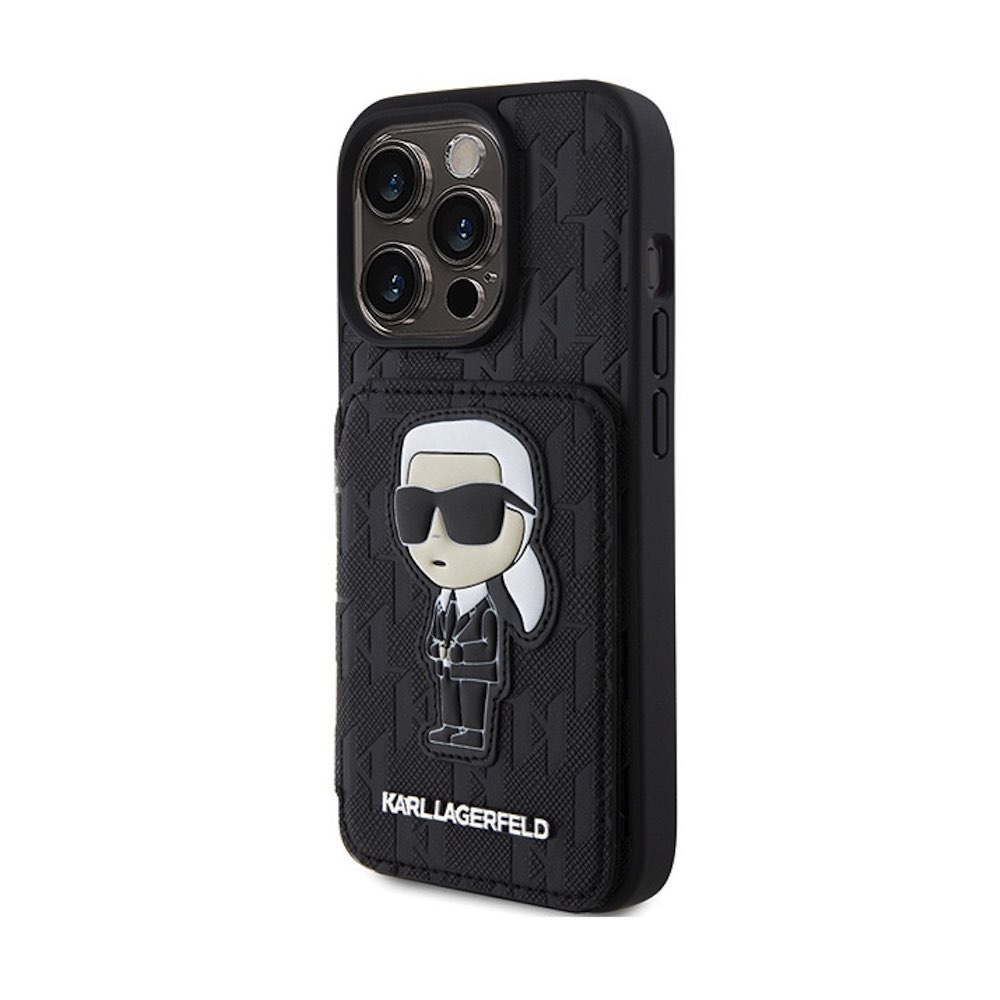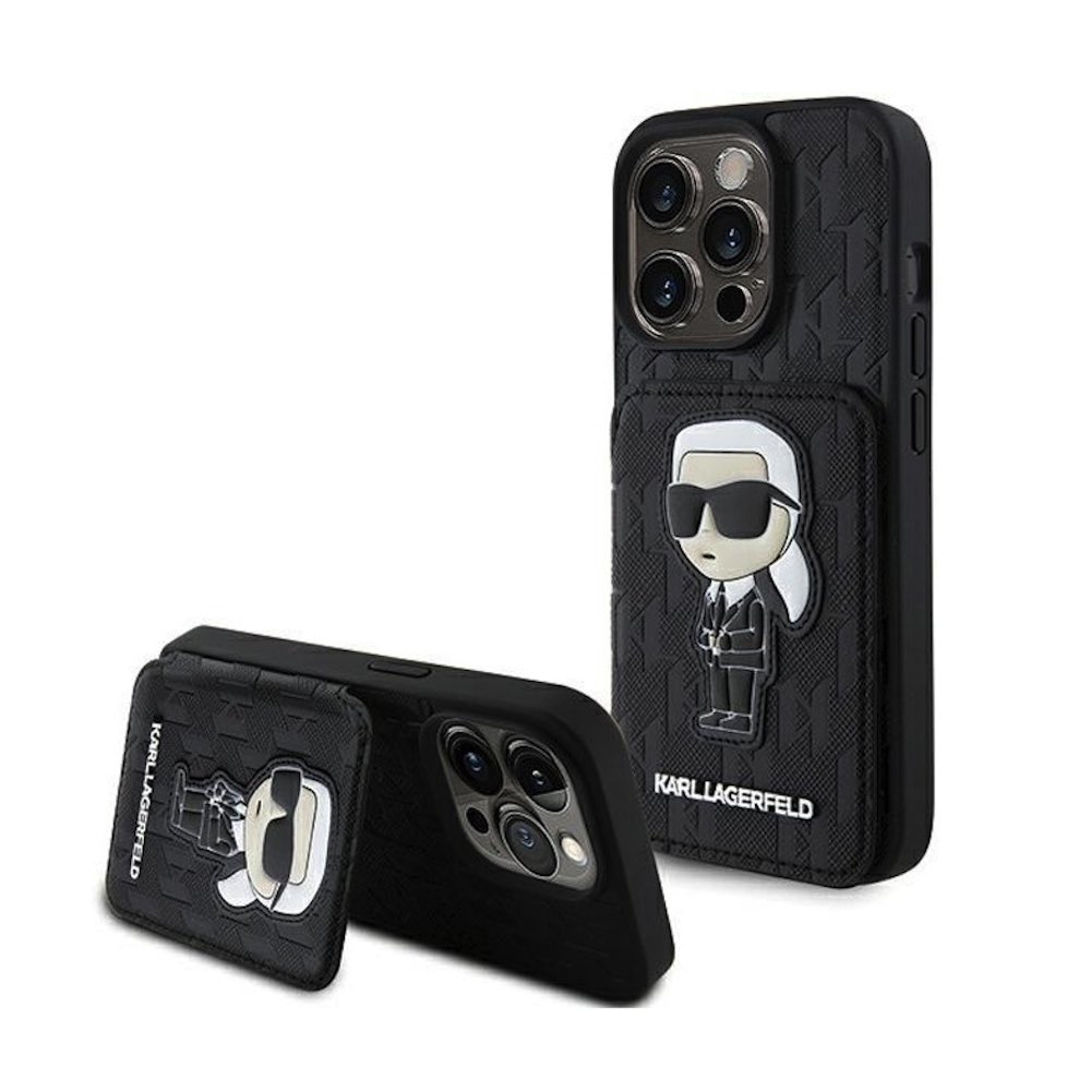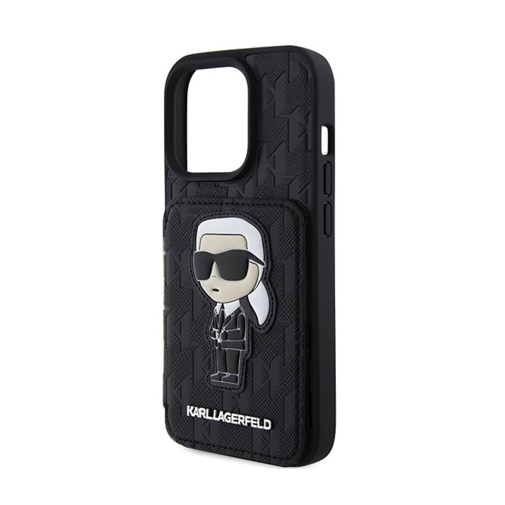 Karl Lagerfeld PU Saffiano Monogram Ikonik Card Slot Stand Case - дизайнерски кожен кейс с отделение за карти за iPhone 15 Pro Max (черен)