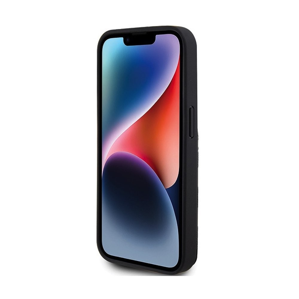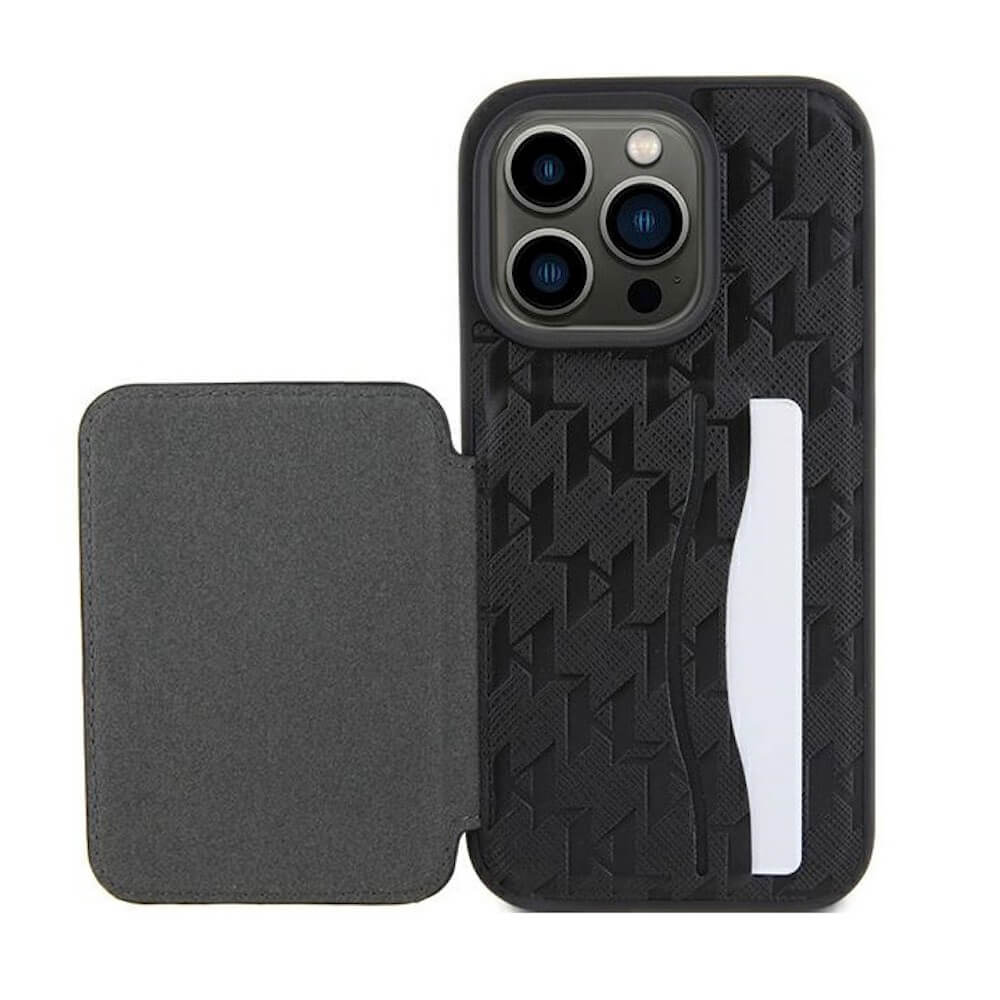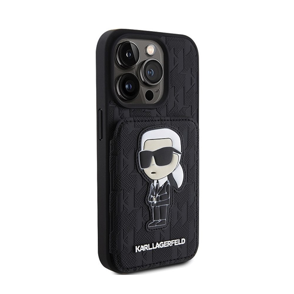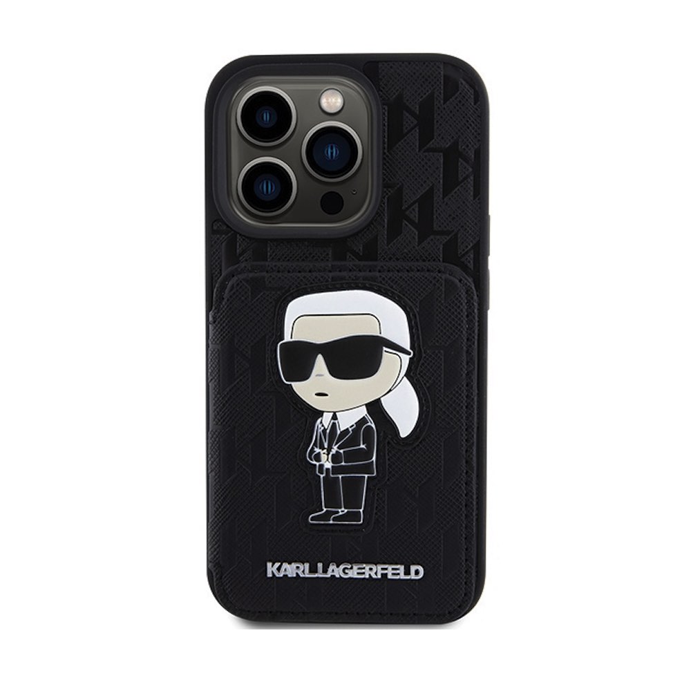 Karl Lagerfeld PU Saffiano Monogram Ikonik Card Slot Stand Case - дизайнерски кожен кейс с отделение за карти за iPhone 15 Pro Max (черен)