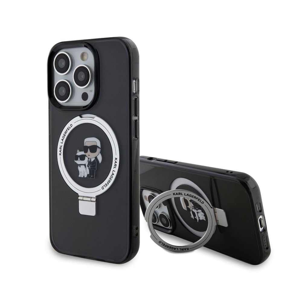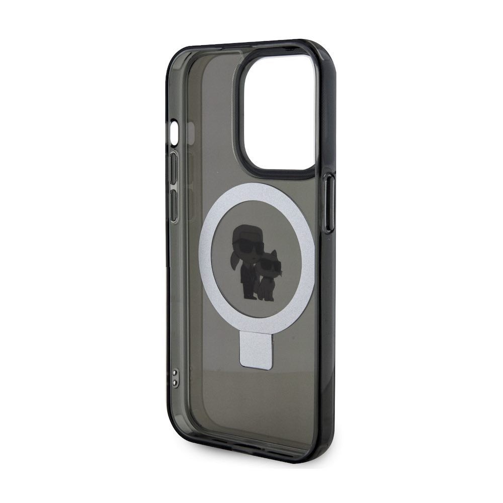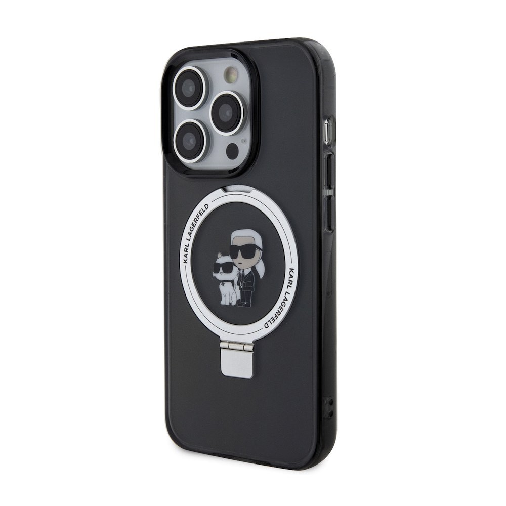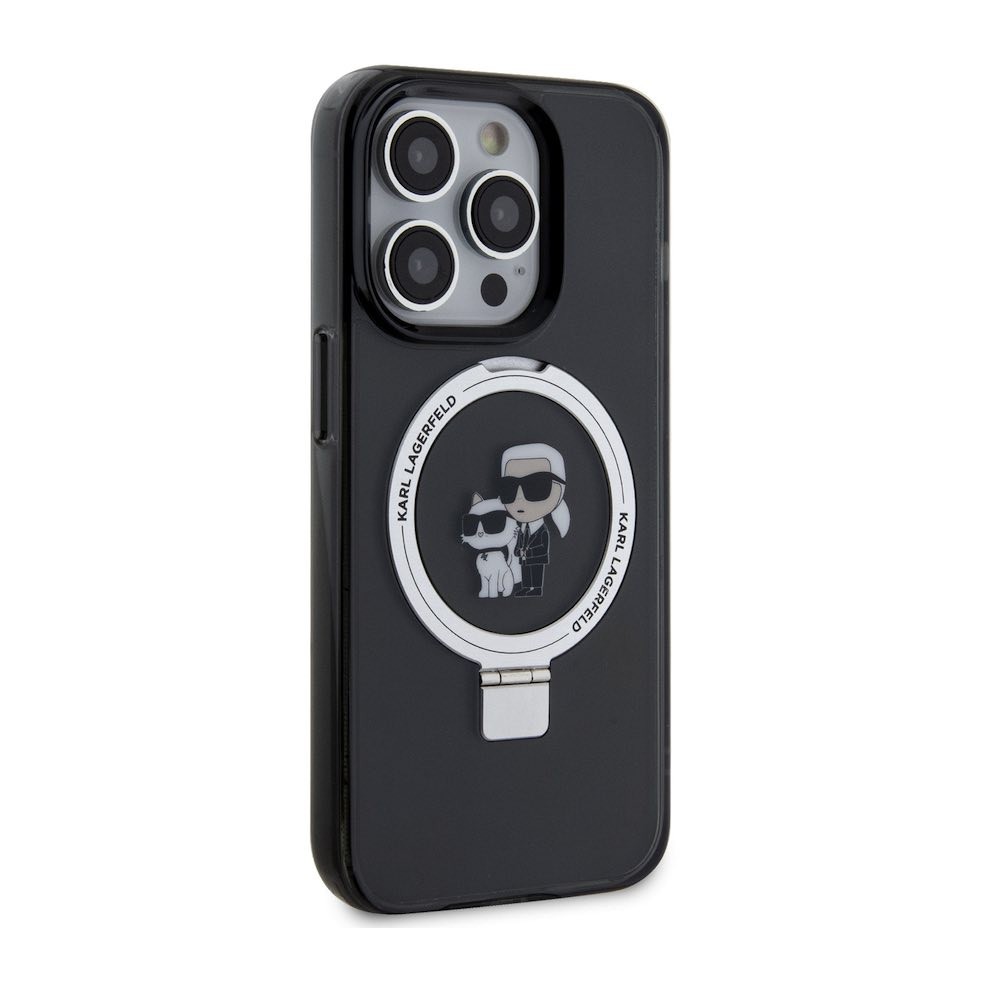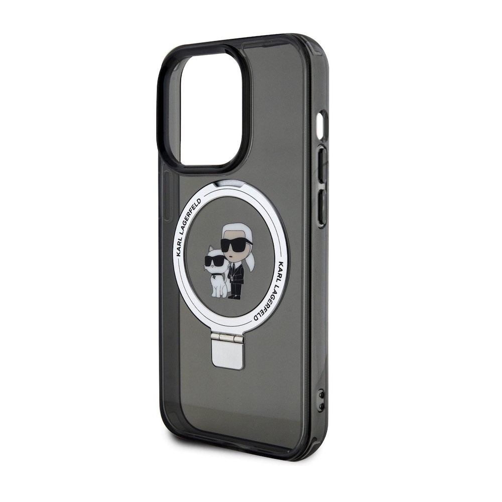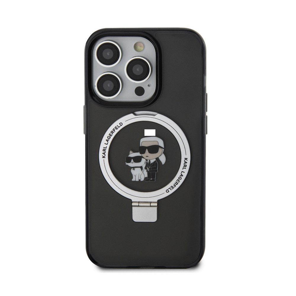 Karl Lagerfeld Ringstand Karl and Choupette MagSafe Case - хибриден удароустойчив кейс с MagSafe за iPhone 15 Pro (черен-прозрачен)