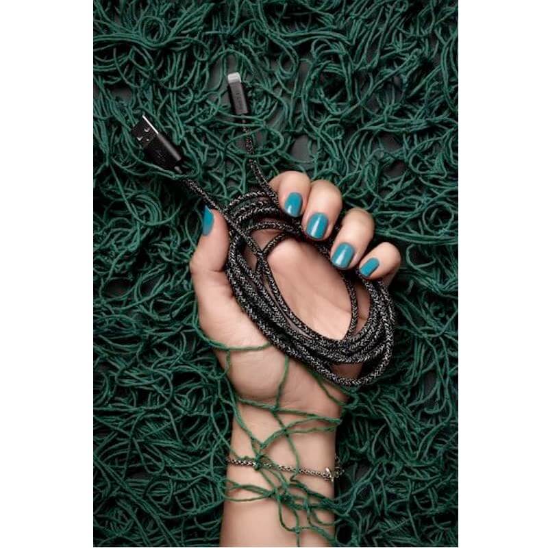 - Единственият в света сертифициран от Apple MFI кабел с корпуси на конекторите, изработени от рециклирана пластмаса и оплетка от океански риболовни мрежи
