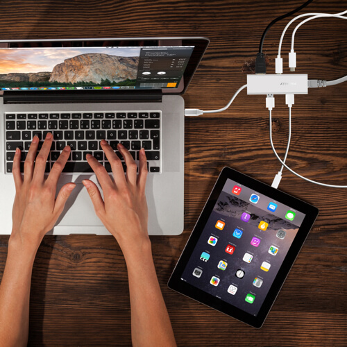 - Единият USB-C порт ви позволява да свържете устройство с USB-C като външен хард диск и поддържа трансфер на данни до 5 Gbps, а другият USB-C порт ви позволява бързо да зареждате вашия MacBook, MacBook Pro или iPad (поддържа технологията Power Delivery до 100W).
