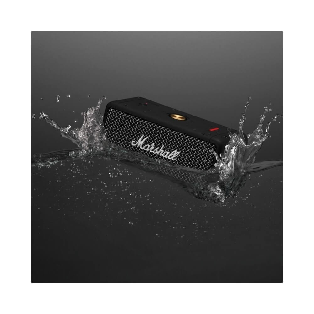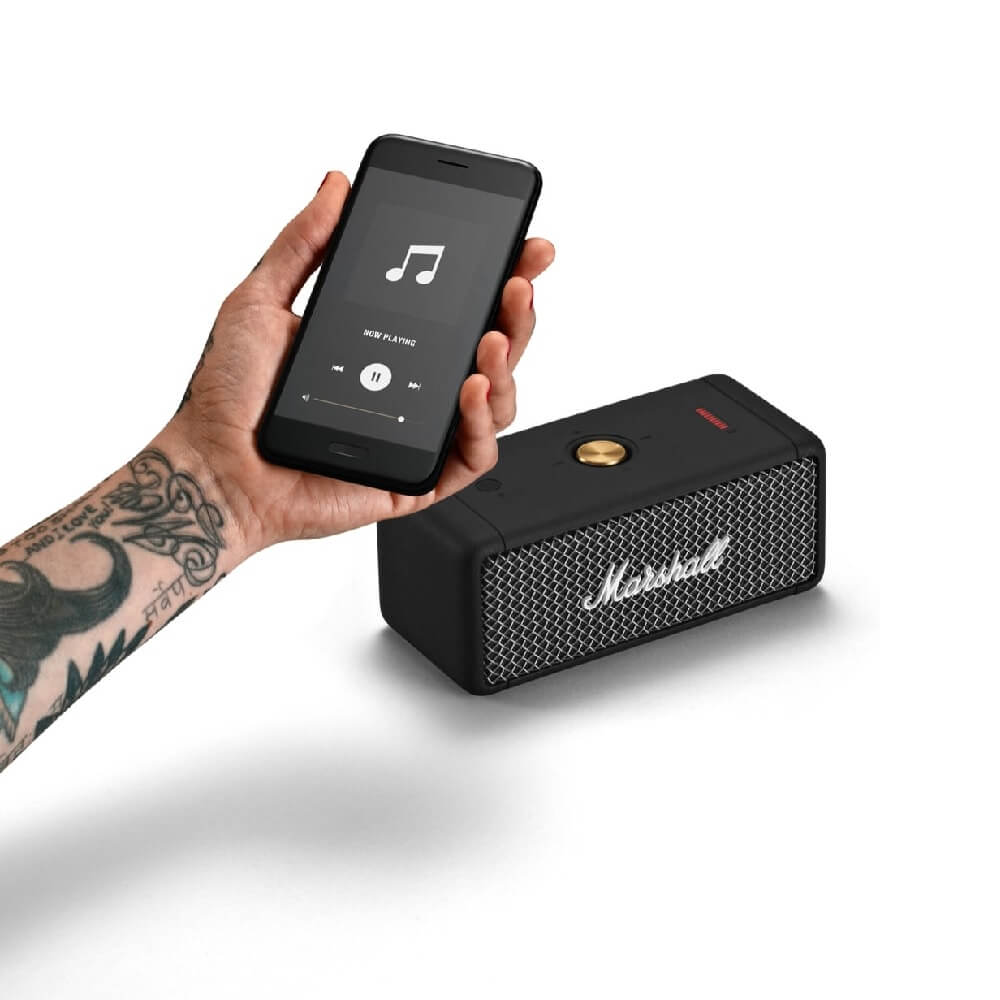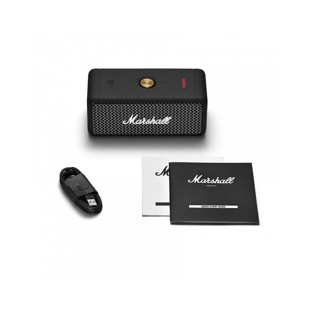 - Marshall Emberton e водоустойчив преносим Bluetooth спийкър, произвеждащ мощен и чист звук за повече от 20 часа с едно зареждане на батерията.
