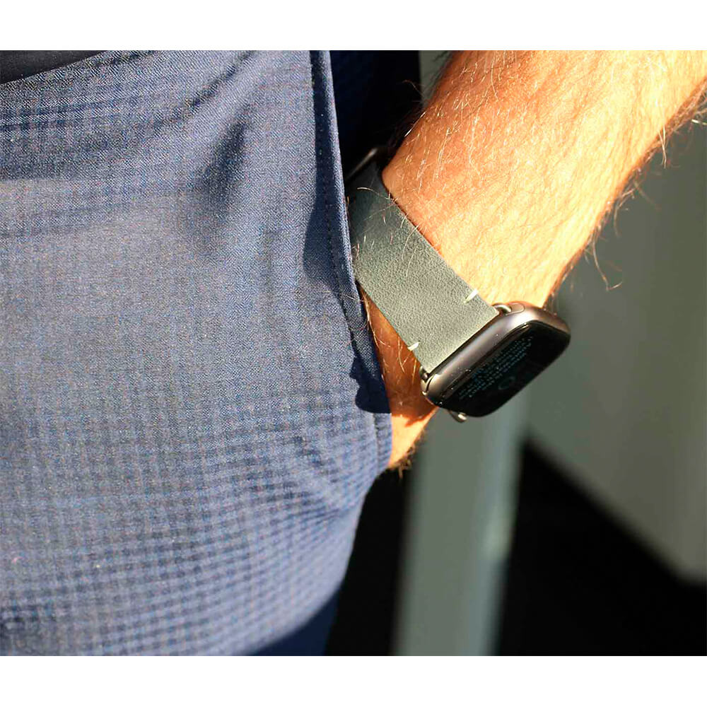 - Някои от снимките на продукта са с различен цвят на елементите за прикрепяне към Apple Watch. Обърнете внимание, че тази каишка е с ЧЕРНИ закрепващи елементи.