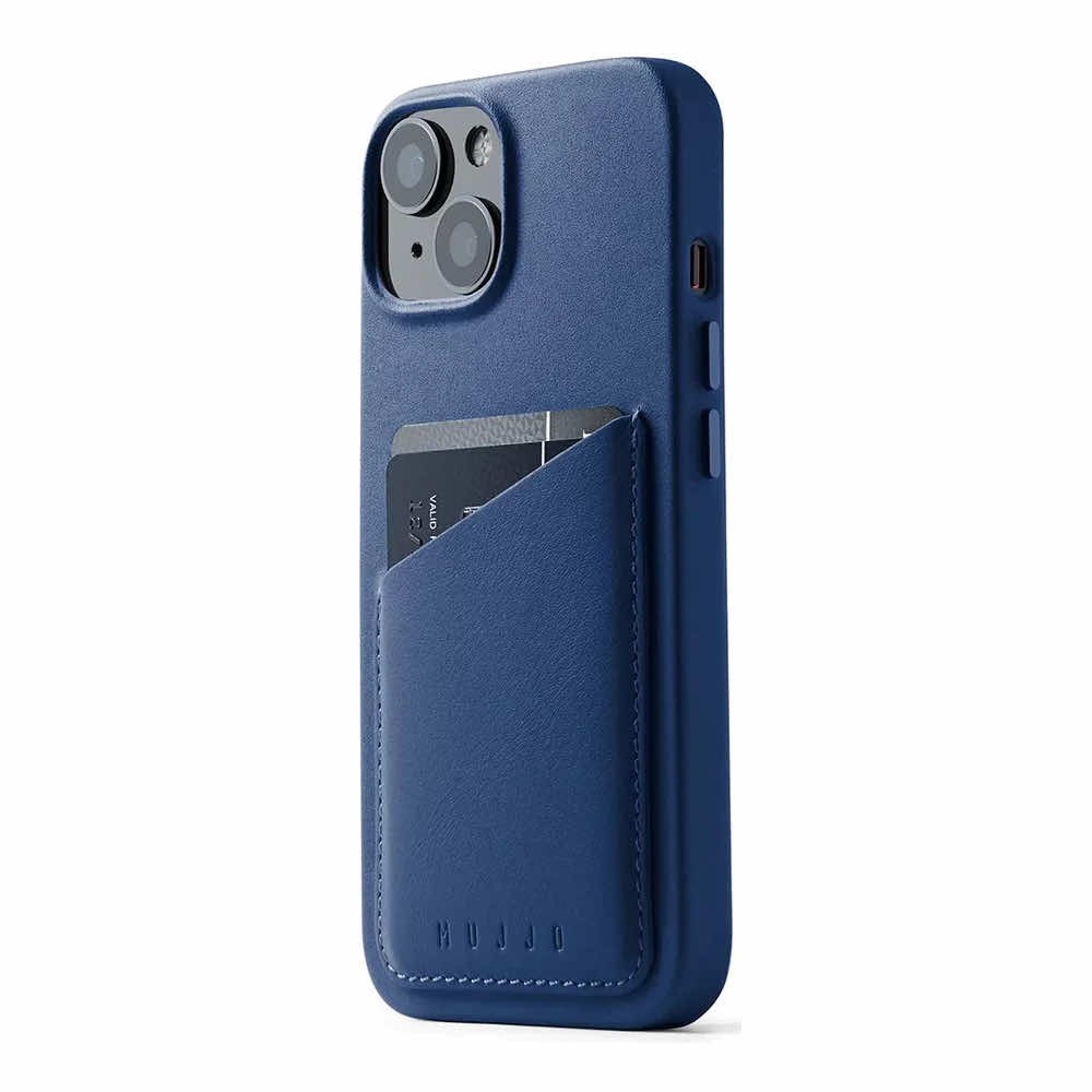 Mujjo Full Leather MagSafe Wallet Case - премиум кожен (естествена кожа) кейс с MagSafe за iPhone 15, iPhone 14, iPhone 13 (син)