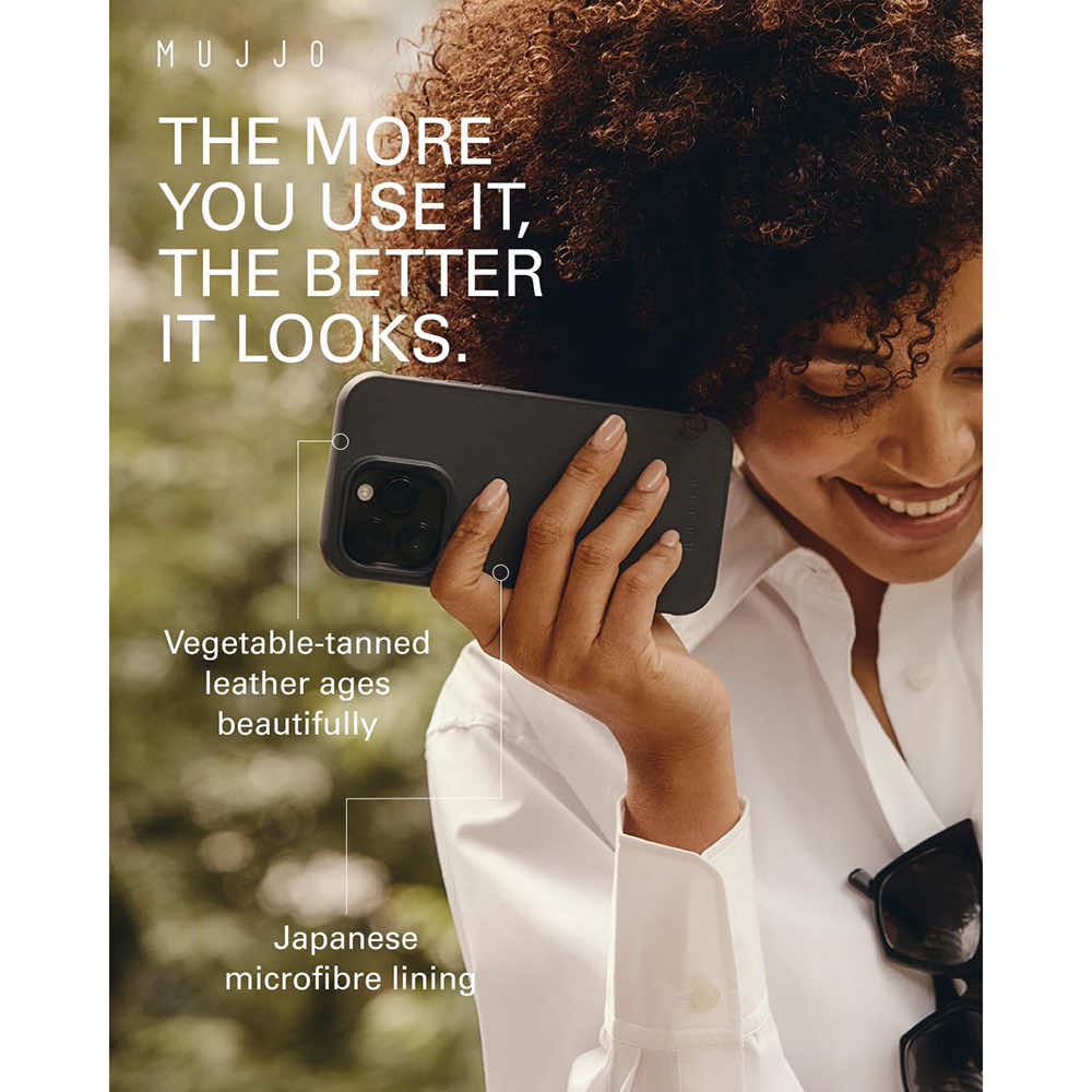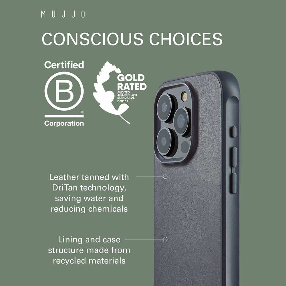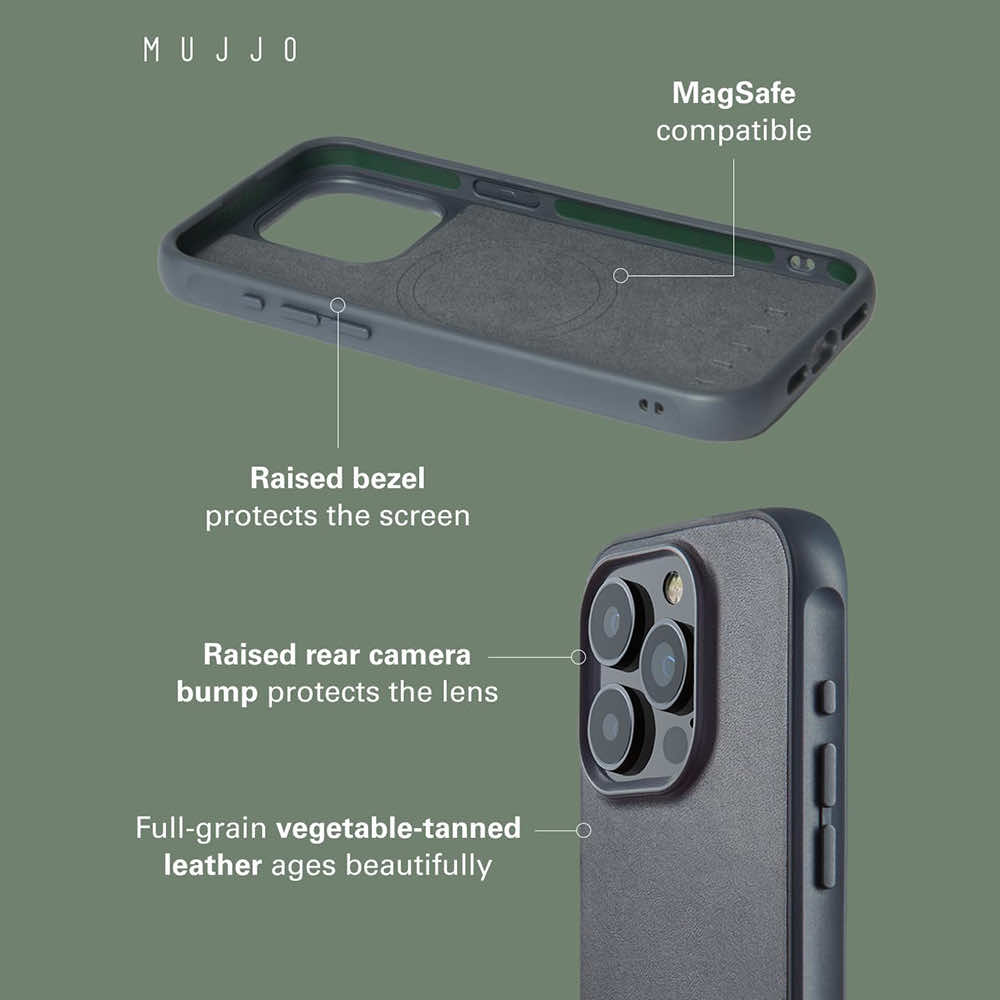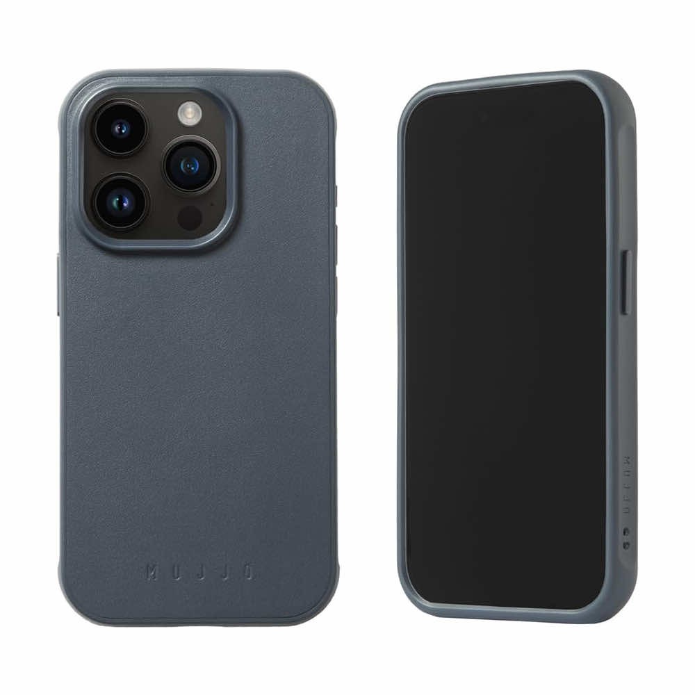 Mujjo Impact Case - хибриден удароустойчив кейс от естествена кожа с MagSafe за iPhone 15 Pro (тъмносин)