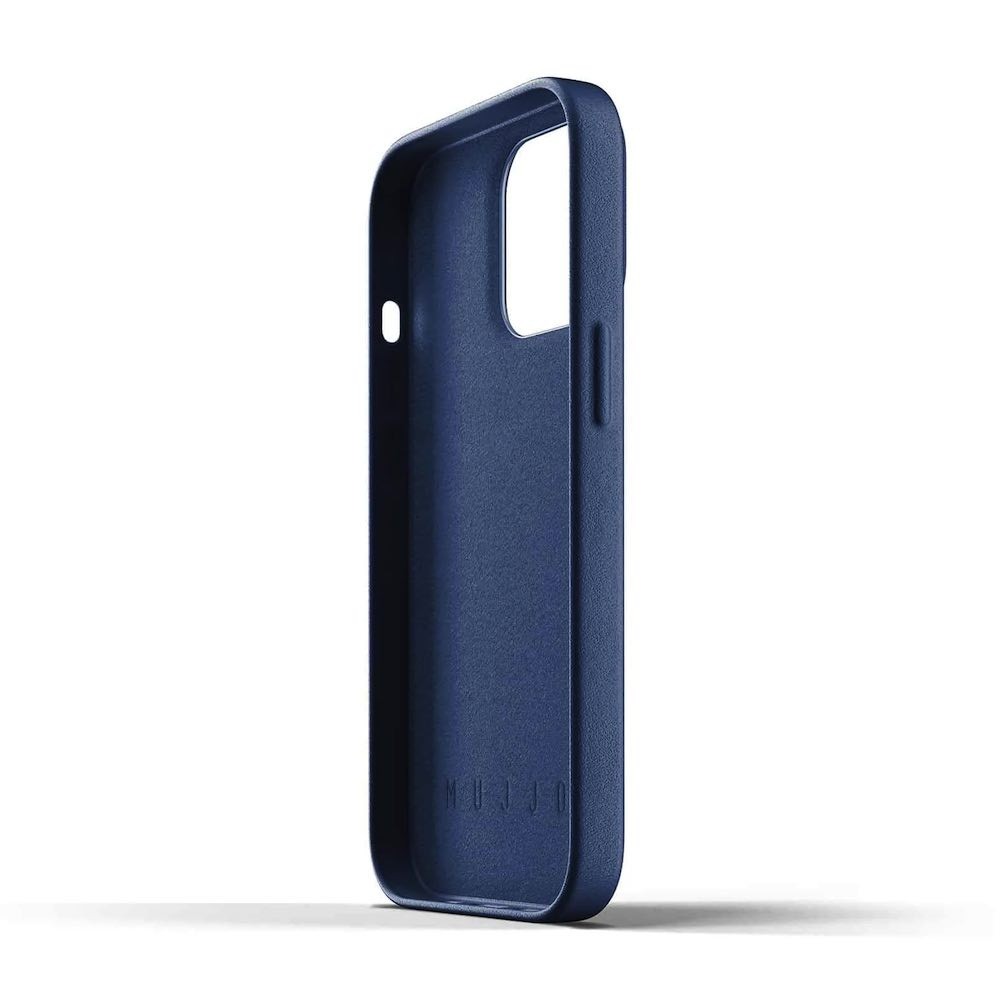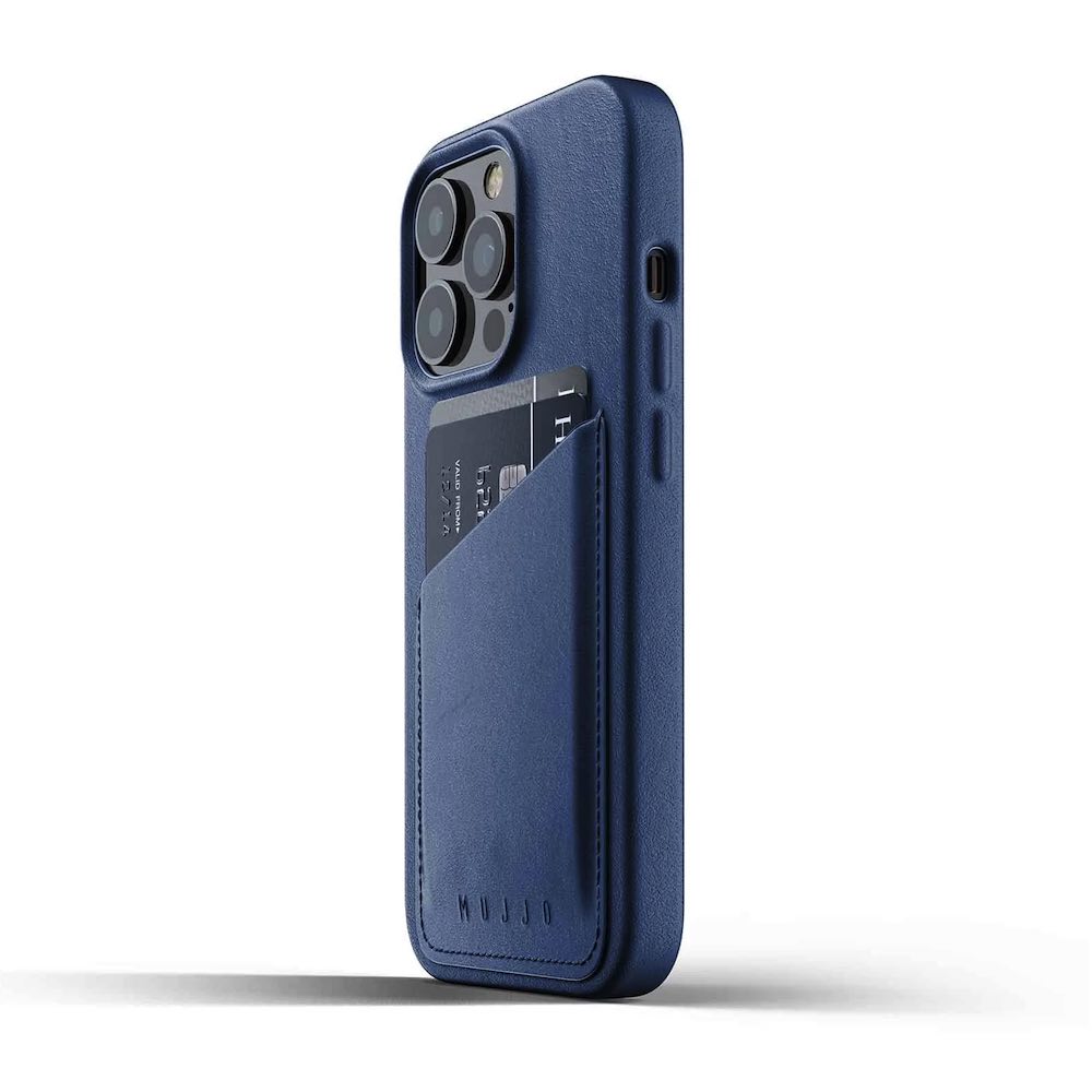 Mujjo Leather Wallet Case - кожен (естествена кожа) кейс с джоб за кредитна карта за iPhone 13 Pro Max (син)