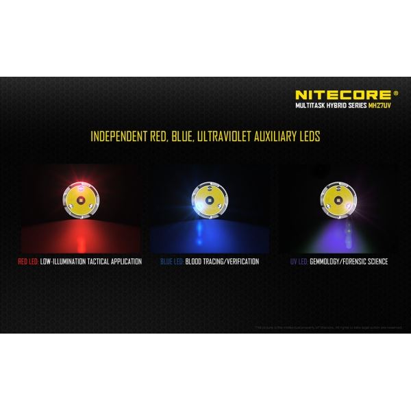 - (използвайки 1 x Nitecore 18650 3400mAh батерия) Turbo: 1000 lumens - до 1 час High: 250 lumens - до 6 часа и 15 минути Mid: 55 lumens - до 28 часа Low: 1 lumen - до 708 часа Red LED: 13 lumens - до 28 часа UV: до 28 часа - (използвайки 2 x CR123 батерии) Turbo: 1000 lumens - до 45 минути High: 250 lumens - до 4 часа и 45 минути Mid: 55 lumens - до 20 часа Low: 1 lumen - до 505 часа Red LED: 13 lumens - до 19 часа Blue LED: 3 lumens - до 19 часа UV: до 19 часа
