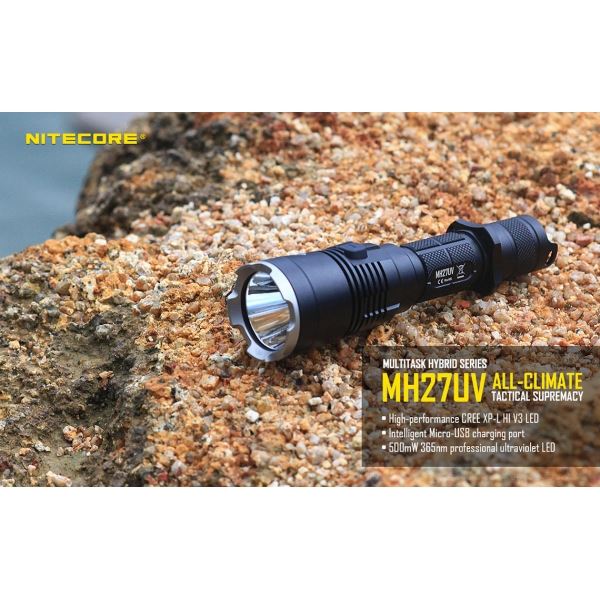 - Nitecore MH27UV Flashlight - USB кабел - калъф - щипка - метален пръстен - връзка за ръка - допълтенителен капак за USB порта - допълнителен о-пръстен - допълнителна капачка