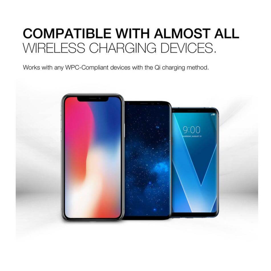 § Съвместимост за безжично захранване: iPhone XS Max,iPhone XS iPhone XR, iPhone 8, iPhone 8 Plus, Samsung Galaxy S9 Plus, Galaxy S9, Galaxy S8, S8 Plus, Note 8, S7, S7 Edge, Galaxy S6 Edge и всички други смартфони поддържащи QI стандарт за безжично захранване