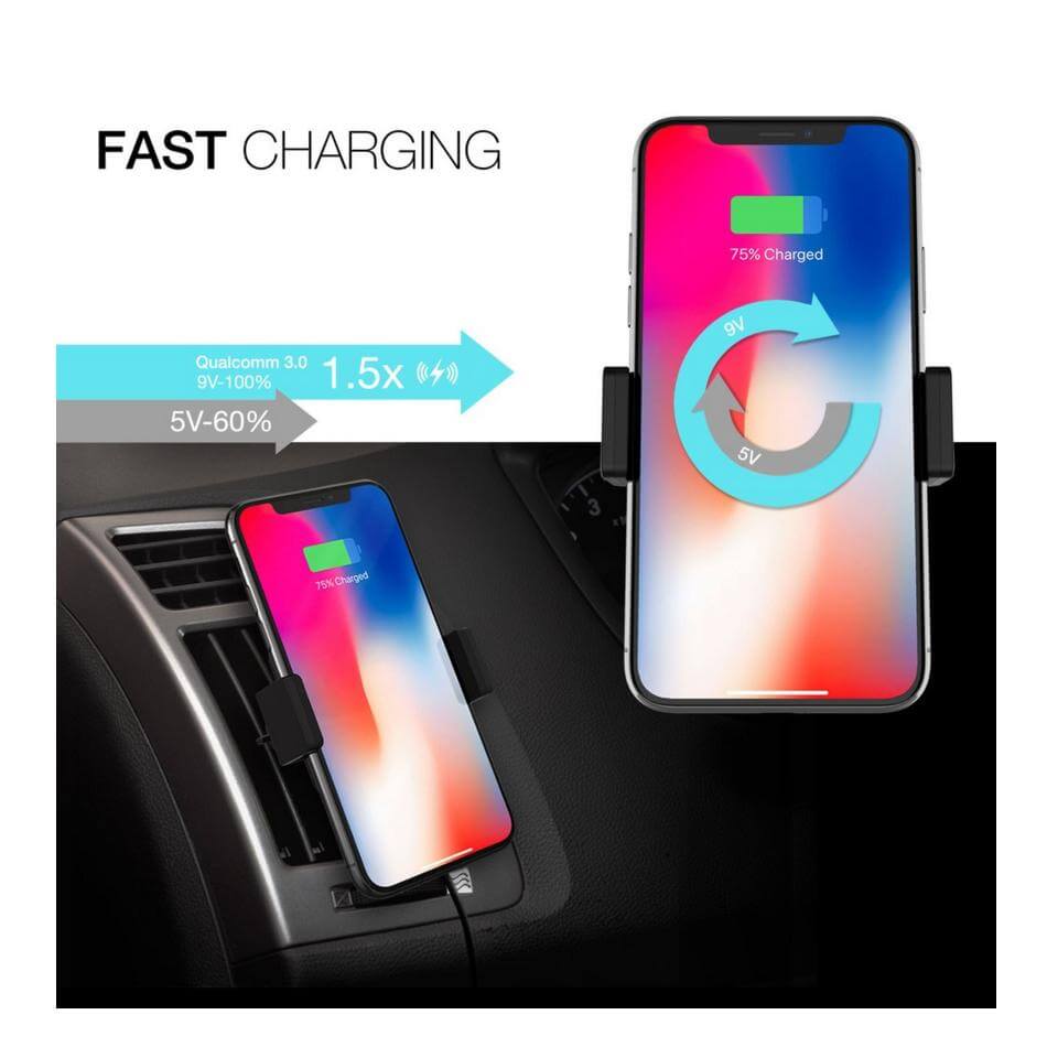 § Функционална магнитна поставка за автомобила, която поддържа бързо и безжично зареждане за смартфони съвместими с Qi