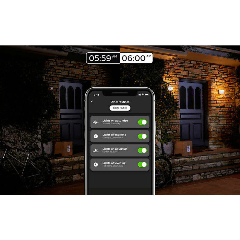 - Интелигентно управление на осветлението когато сте извън дома - Свържете интелигентните си лампи към Hue Bridge и изтеглете приложението Hue, за да сте сигурни, че домът ви е добре осветен, независимо къде се намирате. Настройте модели за леко осветление в приложението, за да включите лампите си в определено време, имитирайки истинско присъствие в дома си.