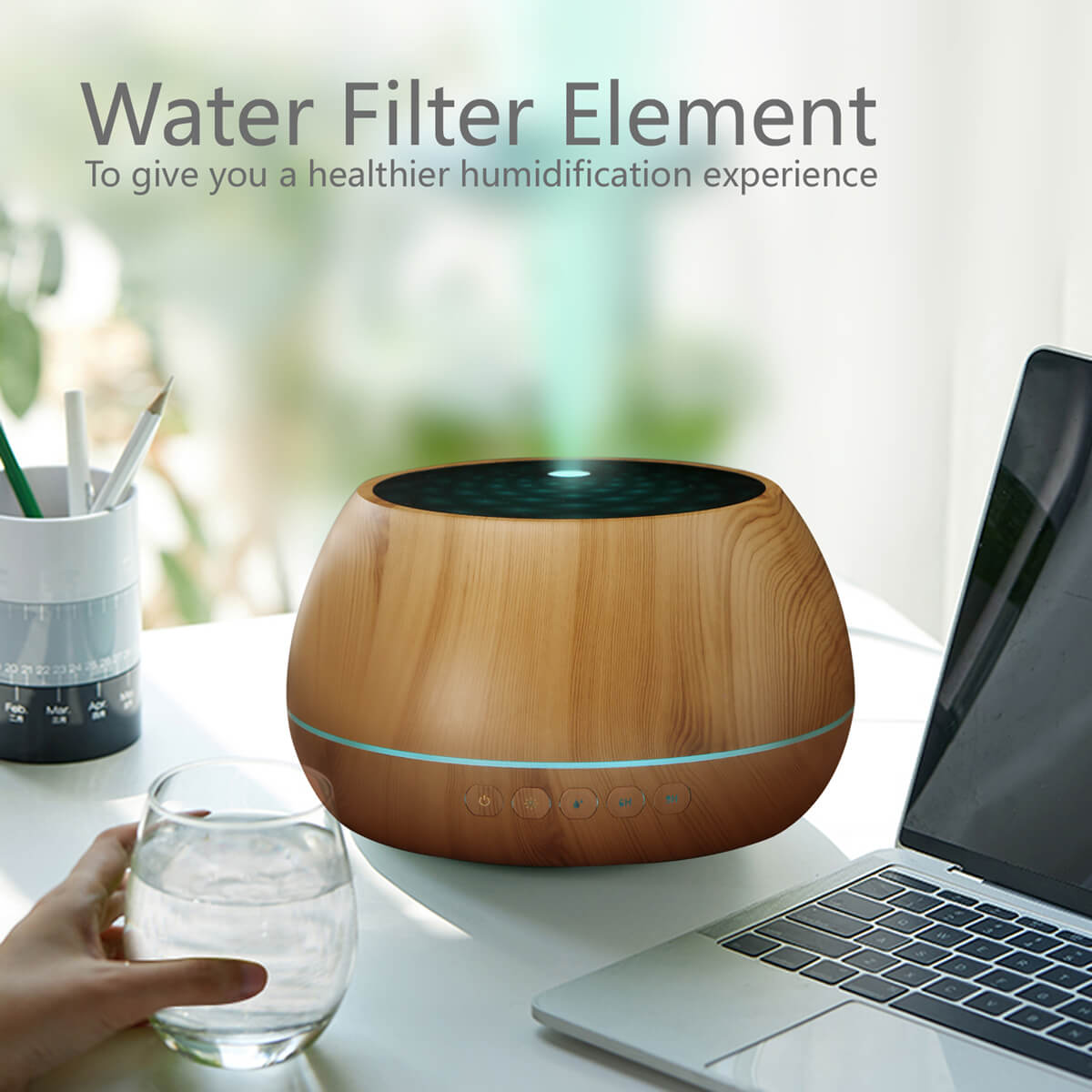 - Стилен, декоративен уред, който генерира микро впръсквания чрез ултразвукова технология, разпределяйки влажен въздух в цялата стая. Чрез добавяне на няколко капки естествени етерични масла към резервоара за вода, може да изпълнява и арома функция