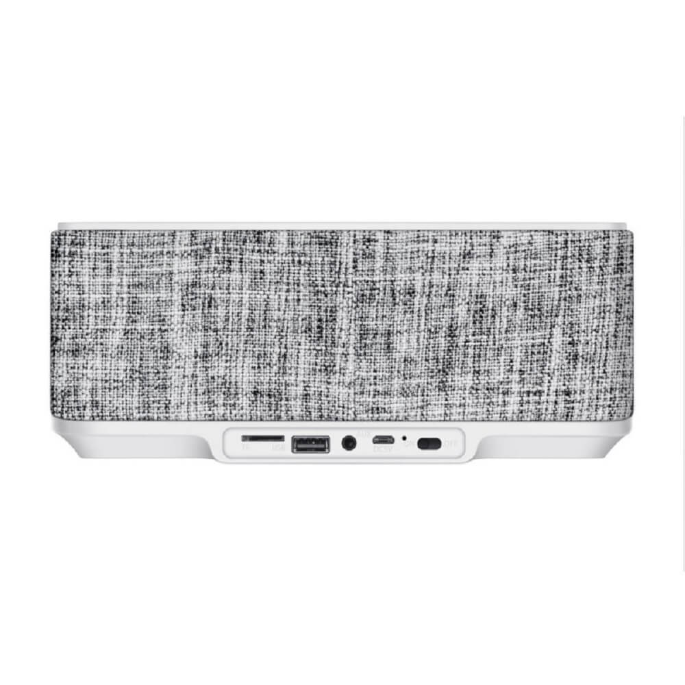 - Елегантен дизайн - Корпусът на високоговорителя е покрит с естетична материя, която е приятна на допир и защитава устройството. Големите бутони, поставени на горната му повърхност, ви позволяват да контролирате музиката