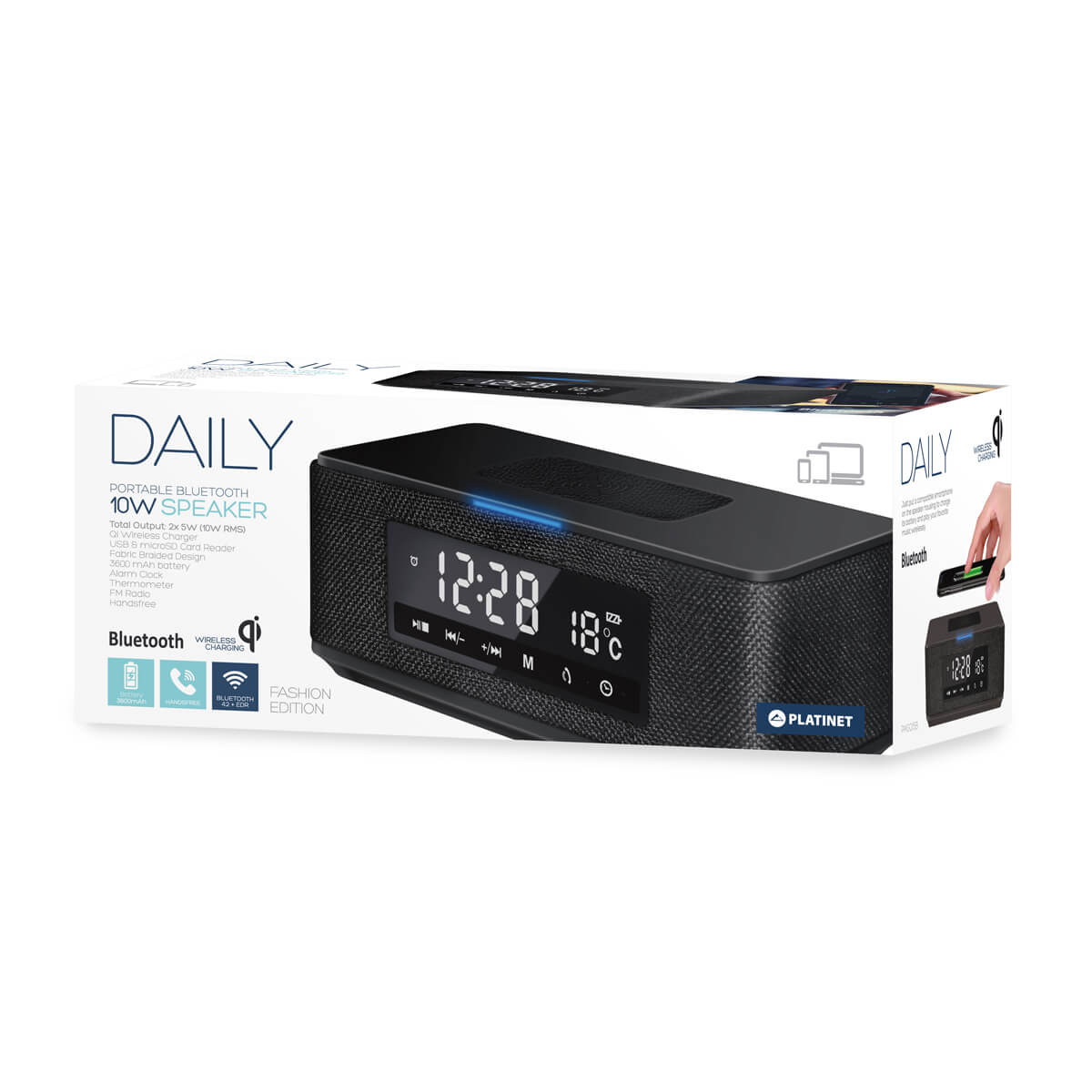 Platinet Speaker Daily PMGQ15B Bluetooth, QI, FM And Clock - безжичен портативен спийкър с FM радио, часовник с аларма и поставка за безжично зареждане (черен)
