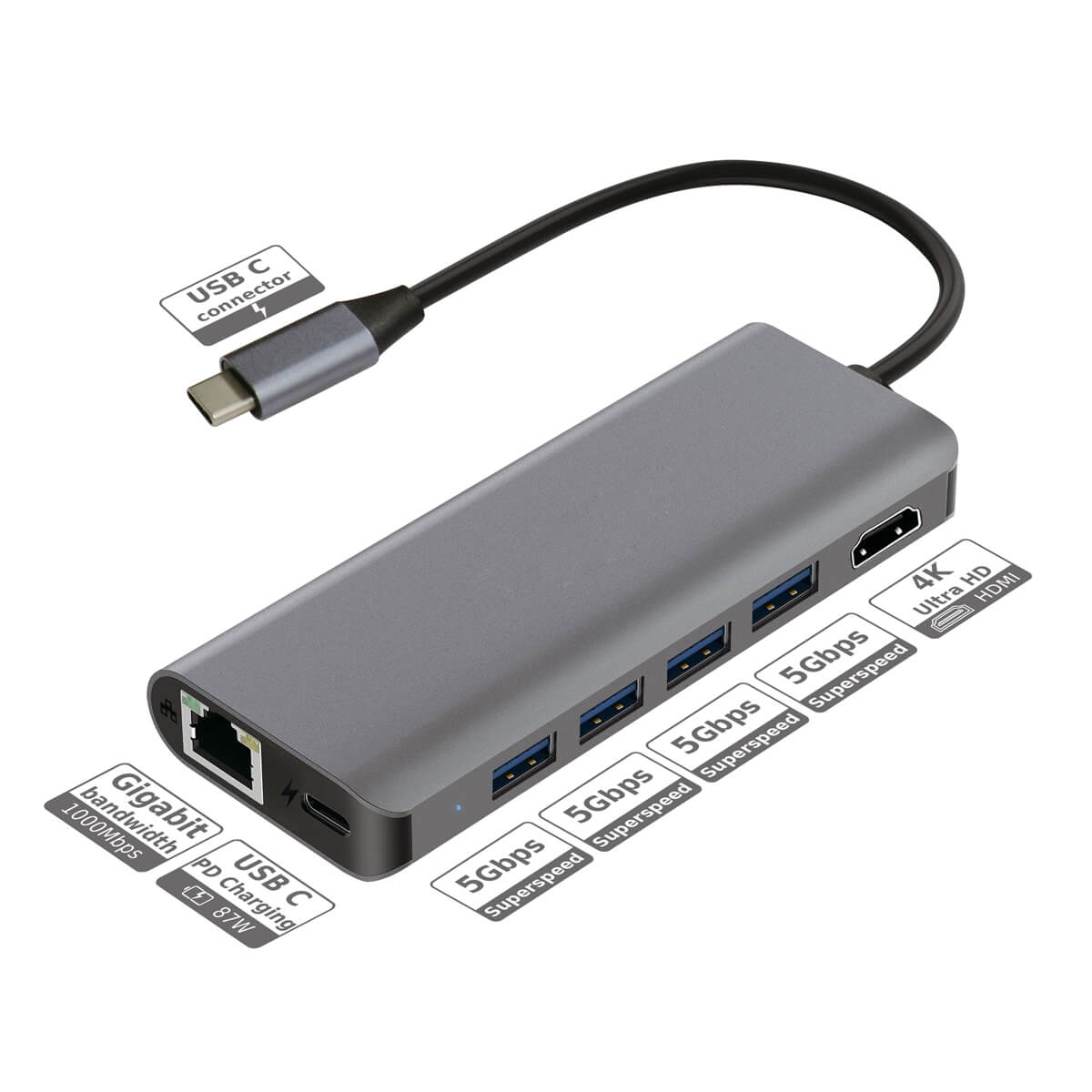 Platinet USB-C Multimedia Adapter 7in1 - USB-C хъб за свързване на допълнителна периферия за компютри с USB-C (тъмносив)