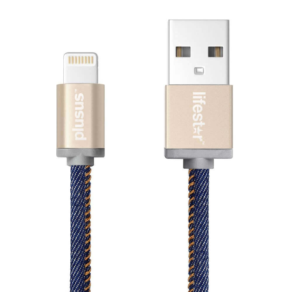 PlusUs LifeStar Handcrafted Lightning Cable - ръчно изработен сертифициран Lightning кабел за iPhone, iPad и iPod (25см.) (син-златист)