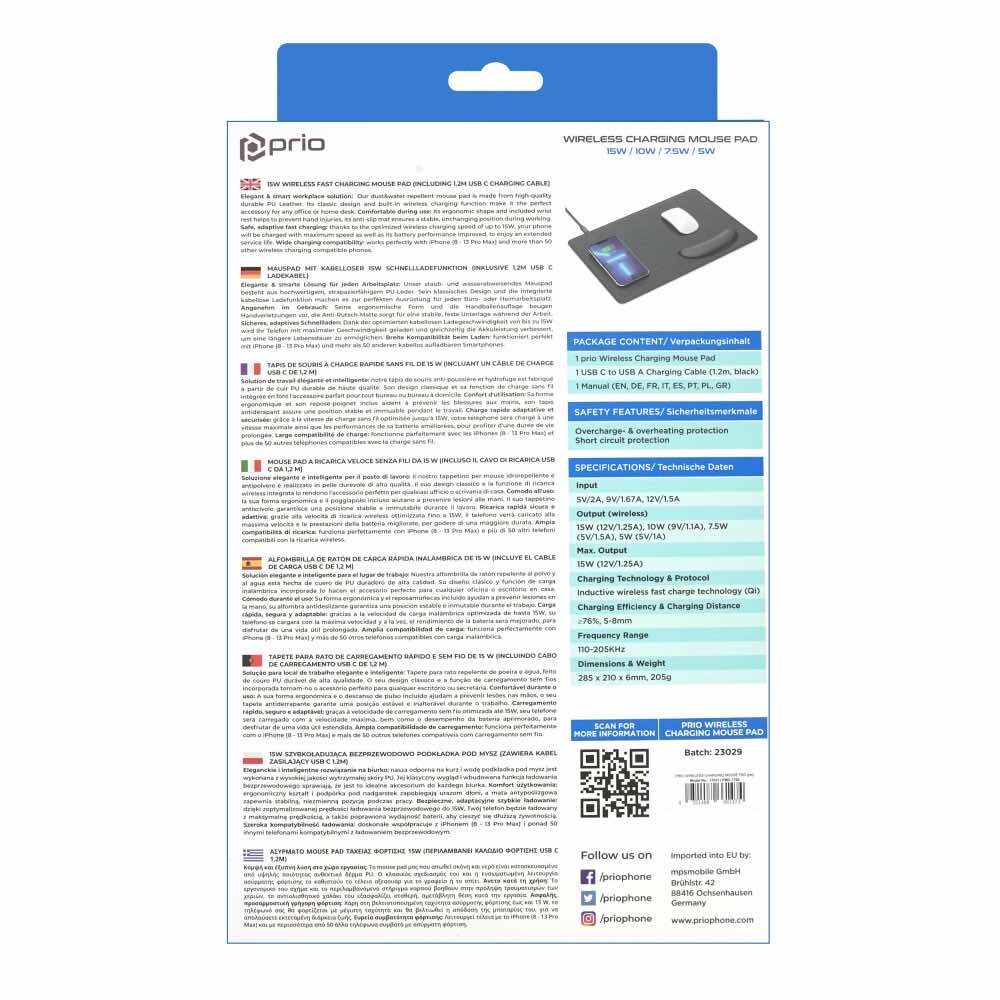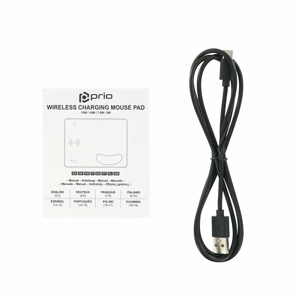 - В комплекта: 1 x Prio Fast Wireless Charging Mouse Pad 15W; 1 x USB-C към USB-A кабел (120 см)