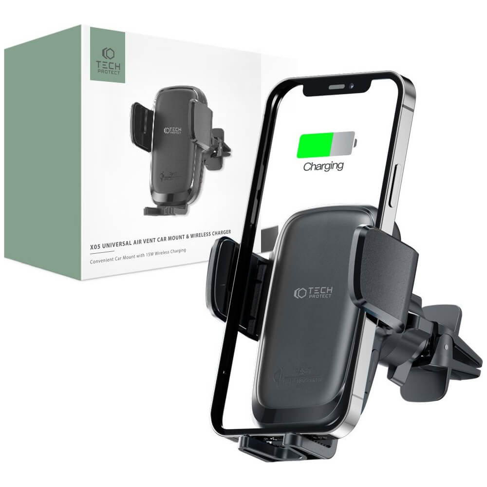 Поставка за радиатора на кола с безжично зареждане за мобилни устройства - Tech-Protect X05 Wireless Charging Car Air Vent Holder 15W (черен)