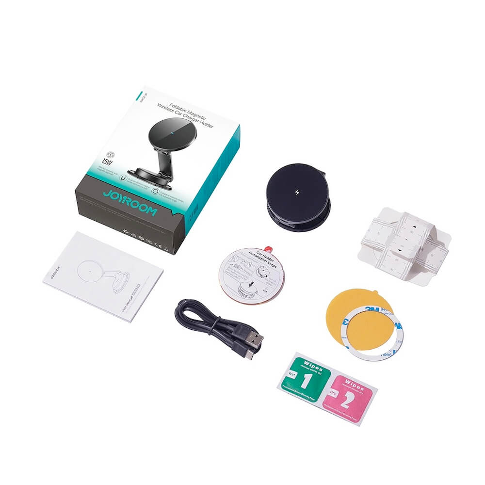 - В комплекта: 1 x Joyroom Foldable MagSafe Cockpit Dashboard Car Mount 15W; 1 x USB-C към USB-A кабел; 1 x метален пръстен за телефони без MagSafe; 1 x ръководство за употреба.