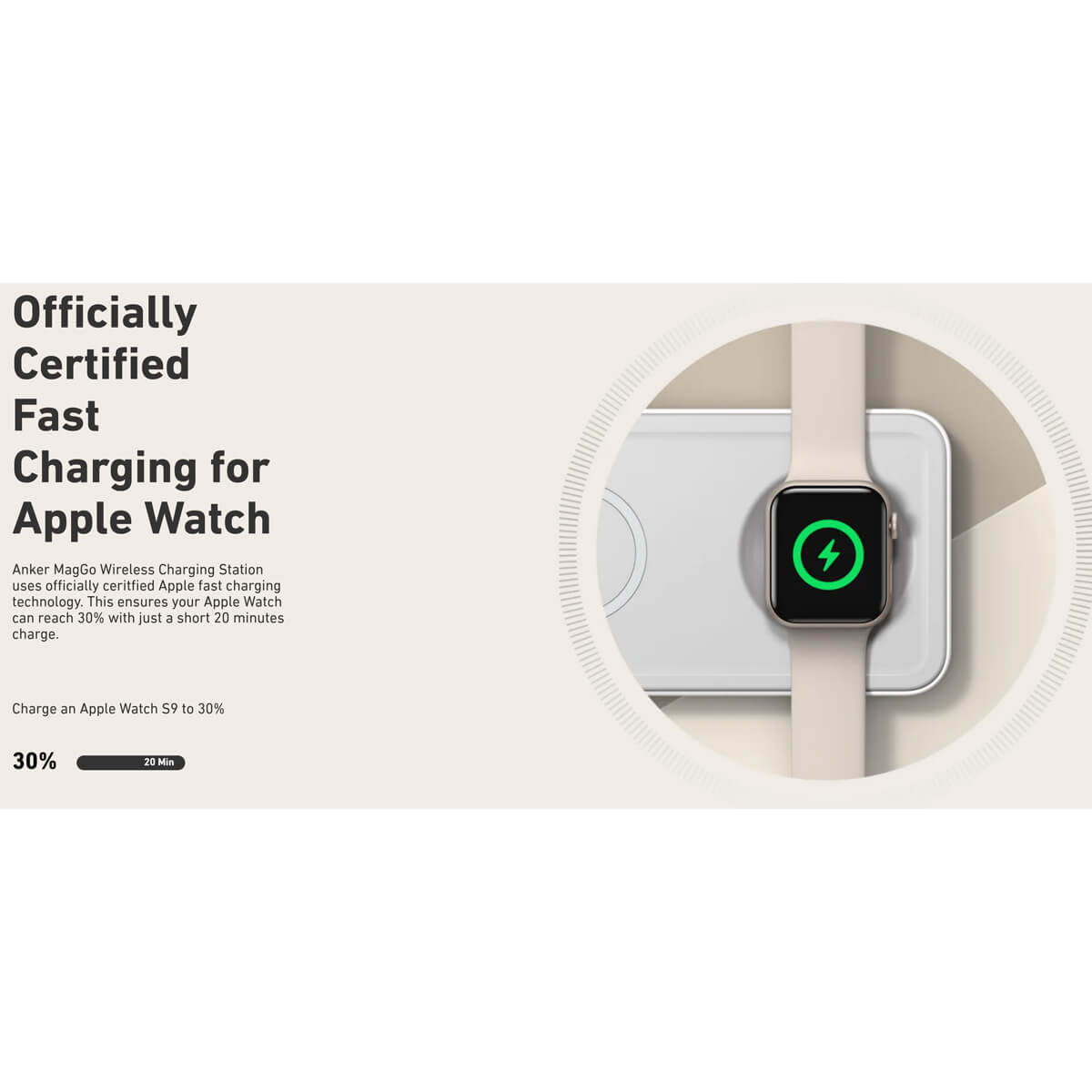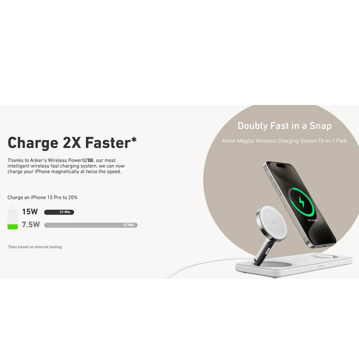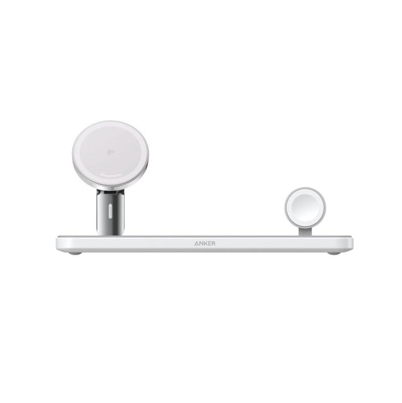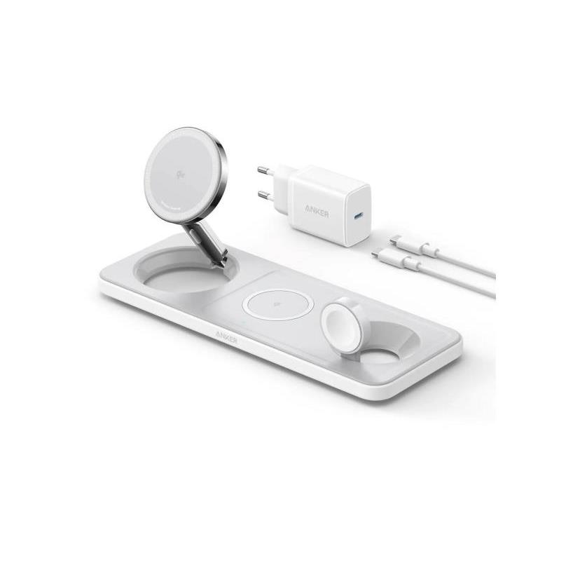 Преносима тройна поставка (пад) за безжично зареждане за iPhone с MagSafe, Apple Watch, AirPods и Qi съвместими мобилни устройства - Anker MagGo 3-in-1 MagSafe Qi2 15W Ultra Fast (бял)