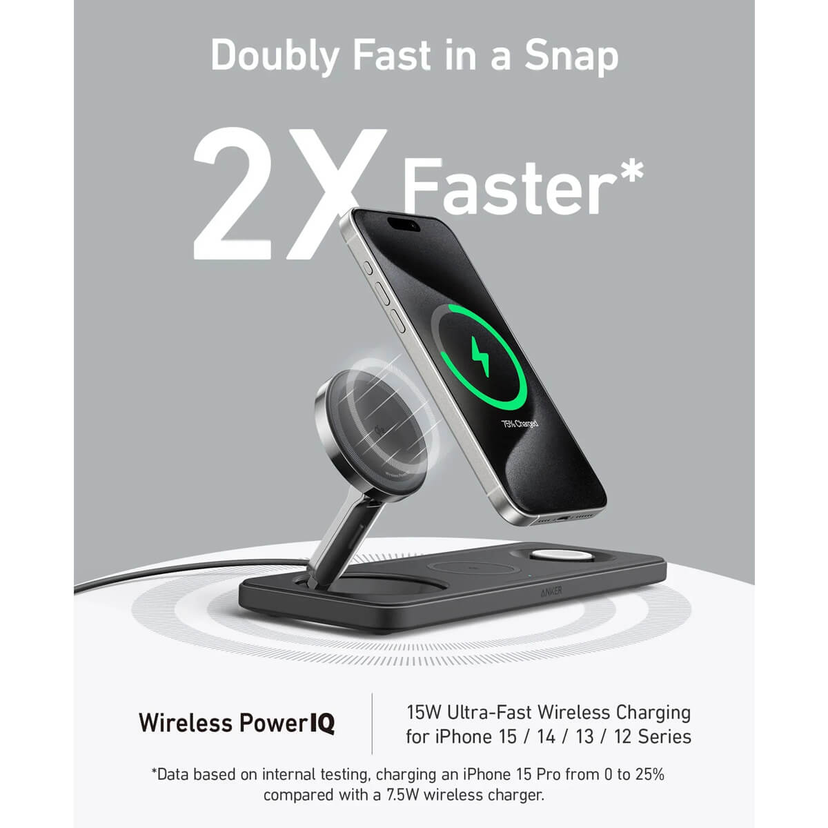 Представяме ви Anker MagGo 3-in-1 MagSafe Qi2 15W UltraFast – идеалното решение за бързо и безопасно зареждане на вашите устройства от Apple. С уникалния си дизайн и висока производителност, той е перфектен за всеки, който цени качеството и удобството.