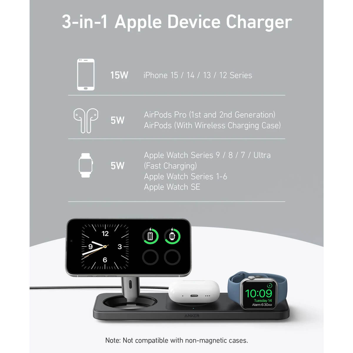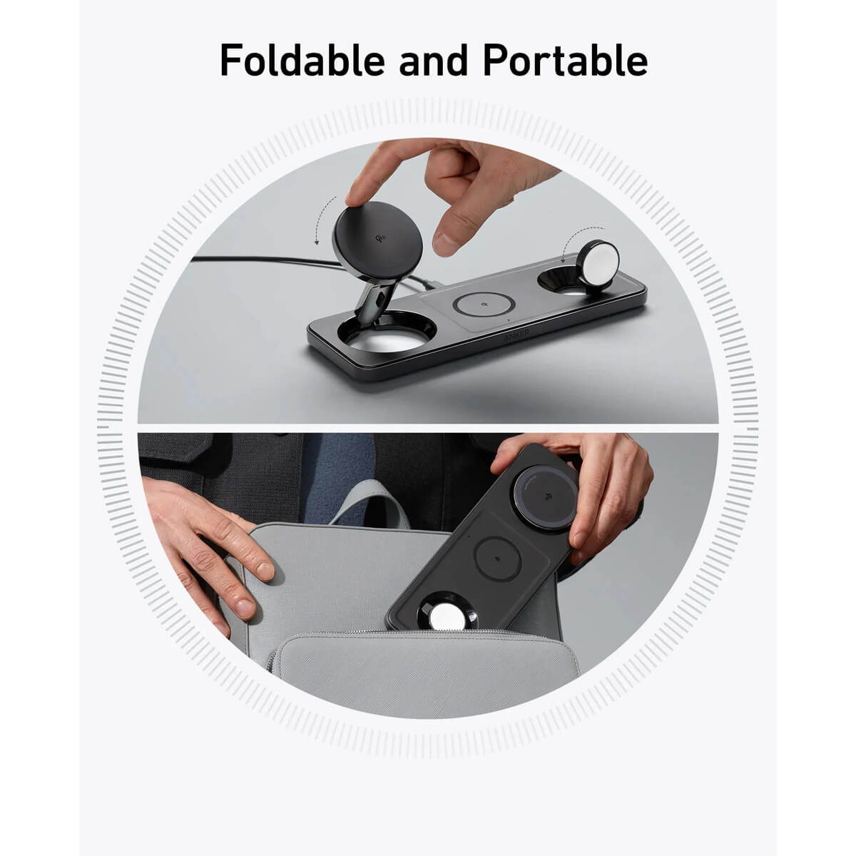 С Anker MagGo можете да зареждате три устройства едновременно, което е изключително удобно за активни потребители. Дизайнът му е не само елегантен, но и функционален, позволявайки ви да настройвате ъгъла на зареждане.