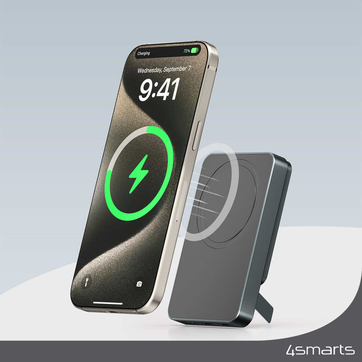 Преносима външна батерия с 2xUSB-C порта и безжично зареждане с MagSafe - 4smarts OneStyle MagSafe PowerBank 5000 mAh (черен)