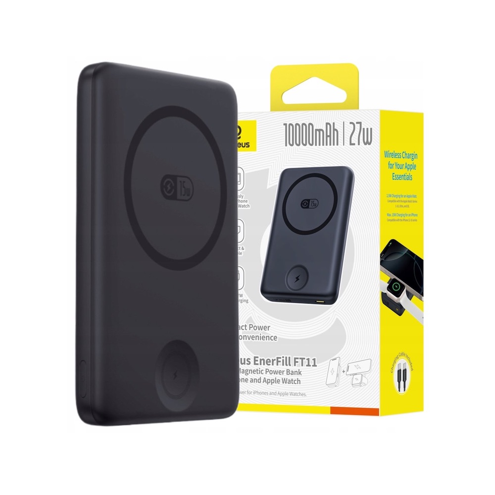 Преносима външна батерия с USB-C порт и безжично зареждане с MagSafe и Apple Watch - Baseus EnerFill FT11 Magnetic Wireless Charging Power Bank 10000 mAh 27W (черен)