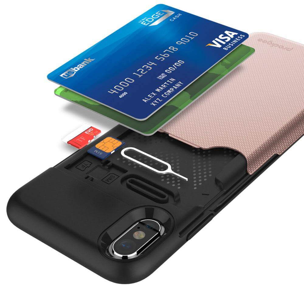 § Налично специално отделение, в задната част на кейса, което се скрива и открива чрез плъзване на твърдата част. В него можеш да съхраняваш до две банкови карти (кредитна, дебитна), nano SIM карта, microSD карта памет и скоба за вадене на сим картата от телефона