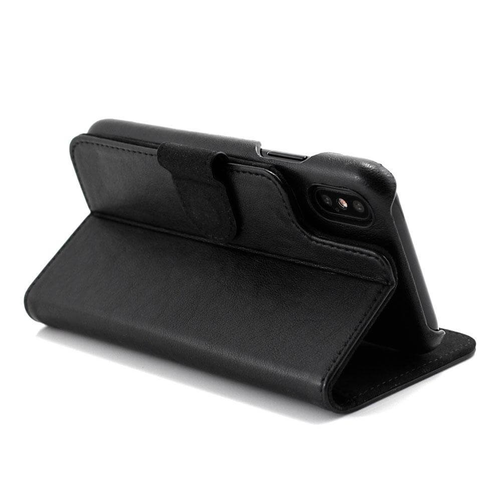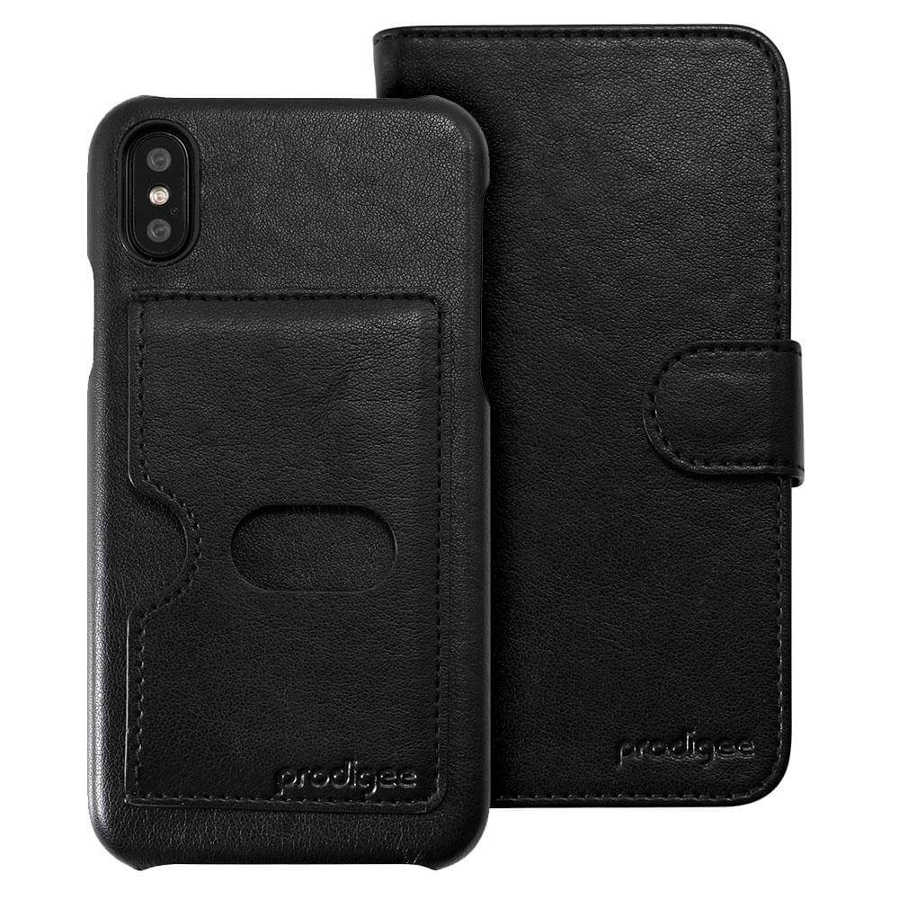 Prodigee Wallegee Case - кожен калъф, тип портфейл с отделящ се кейс и поставка за iPhone XS, iPhone X (черен)